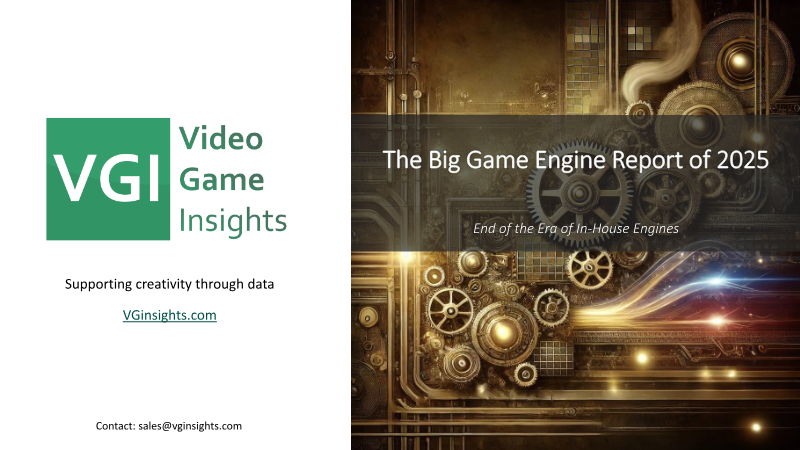ReportThe Big Game Engine Report 2025 examines the shifting landscape of game development technology, focusing on the transition from proprietary in-house tools to third-party public engines. The analysis covers over 13,000 games released on Steam, tracking market share trends from 2012 through 2024 with projections reaching 2030. Findings are based on proprietary estimations and tagging methodologies that categorize engines into three tiers: dominant public engines (Unity and Unreal), smaller public engines (Godot, GameMaker, RPG Maker), and custom in-house engines used by major AAA studios. The central thesis posits that the era of dominant in-house engines is ending as major studios increasingly adopt Unreal Engine 5 to reduce maintenance costs and access a broader talent pool. While custom engines powered over 70% of Steam releases in 2012, they accounted for only 13% of releases in 2024. In terms of commercial performance, custom engines still represent 42% of units sold, but this is the first time they have fallen below the 50% threshold. Unreal Engine has capitalized on this shift, particularly in the AAA space, while Unity remains the leader in sheer volume, powering 51% of all 2024 releases. The data highlights a clear correlation between game size and engine choice. Unity dominates the "Tiny" and "Small" categories (under 100k units), whereas custom engines and Unreal Engine control the "Large" segment (over 1M units). Emerging trends show Godot as the fastest-growing smaller engine, driving over two-thirds of the growth in its tier since 2020. Looking forward, the industry expects a continued migration toward Unreal Engine 5, with Unity projected to face increasing pressure from open-source alternatives like Godot in the indie sector while struggling to gain further ground in the high-end AAA market.