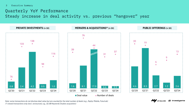 In Q1 2024, venture funding reached $1.3 billion across 153 deals, reflecting a 22.1 % quarter‑over‑quarter increase in deal value and a 23.3 % rise year‑over‑year, while the total deal count held steady at roughly 1,100, down 17.3 % from the same period in 2023. Excluding Disney’s pending $1.5 billion injection into Epic Games, the market shows a steady state after pandemic‑driven volatility, with projected 2024 funding poised to exceed 2023 by about $1 billion. Development‑focused investments outperformed content, driven largely by a single blockchain infrastructure transaction, yet analysts expect content to reclaim the majority of capital as high‑quality game pipelines mature. Exit activity remained muted, with no recorded exit value for the quarter.