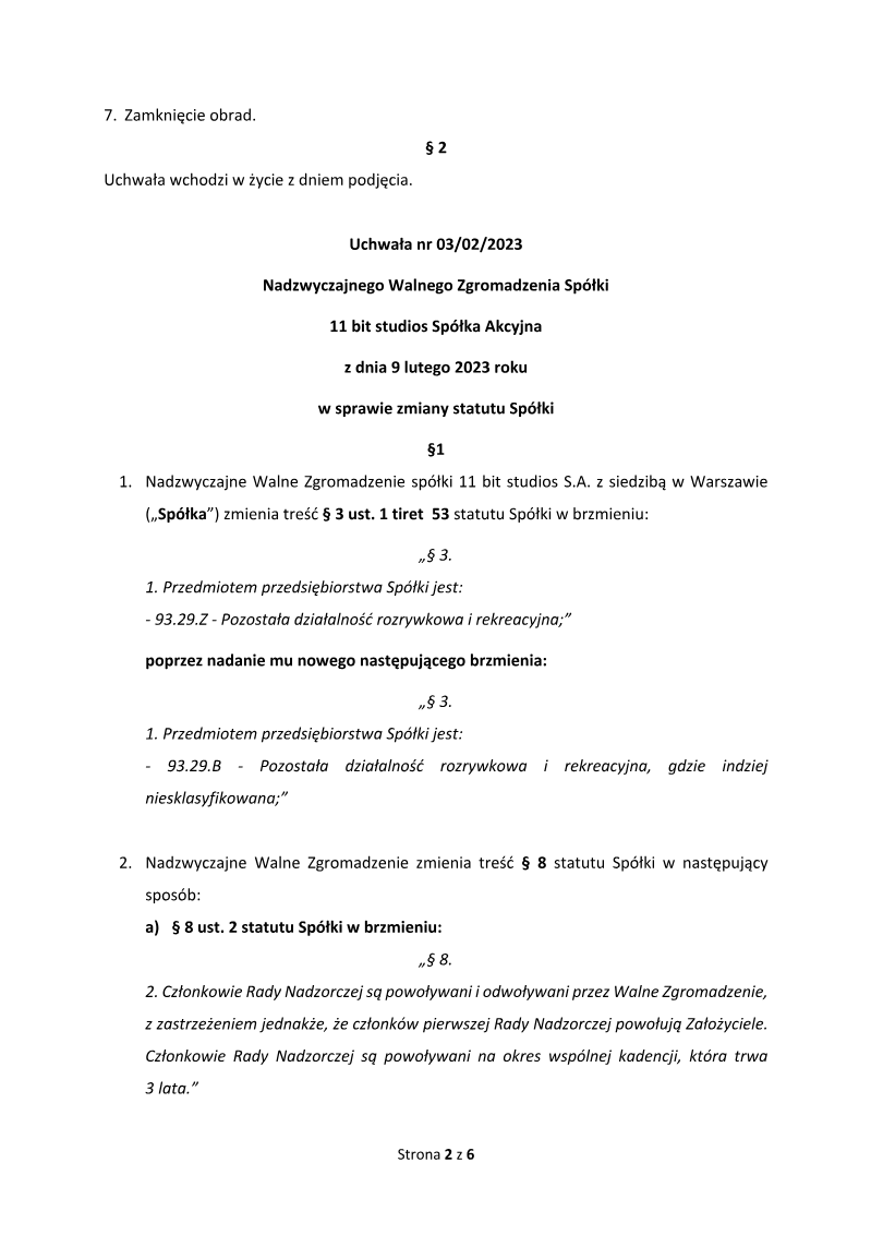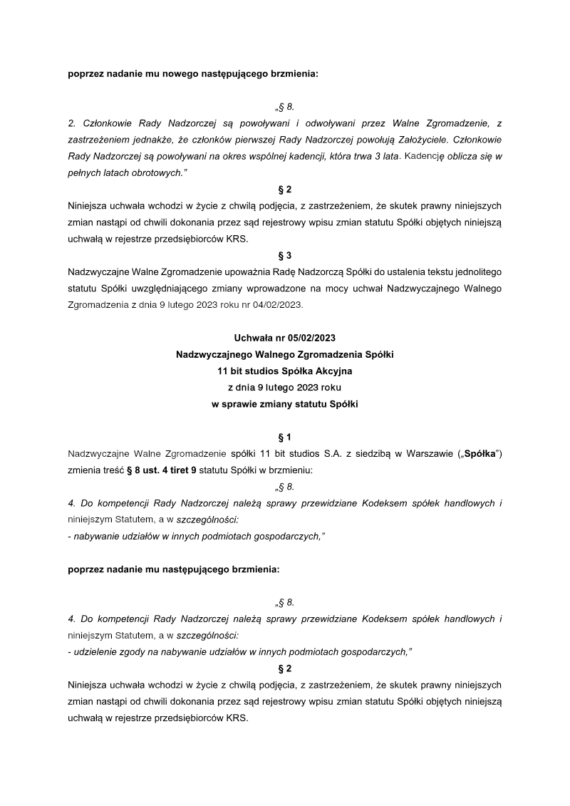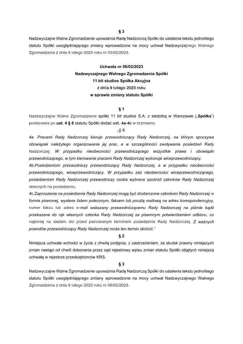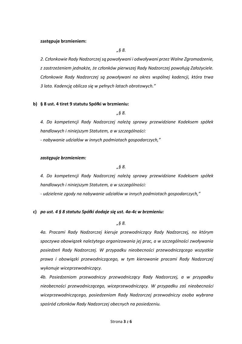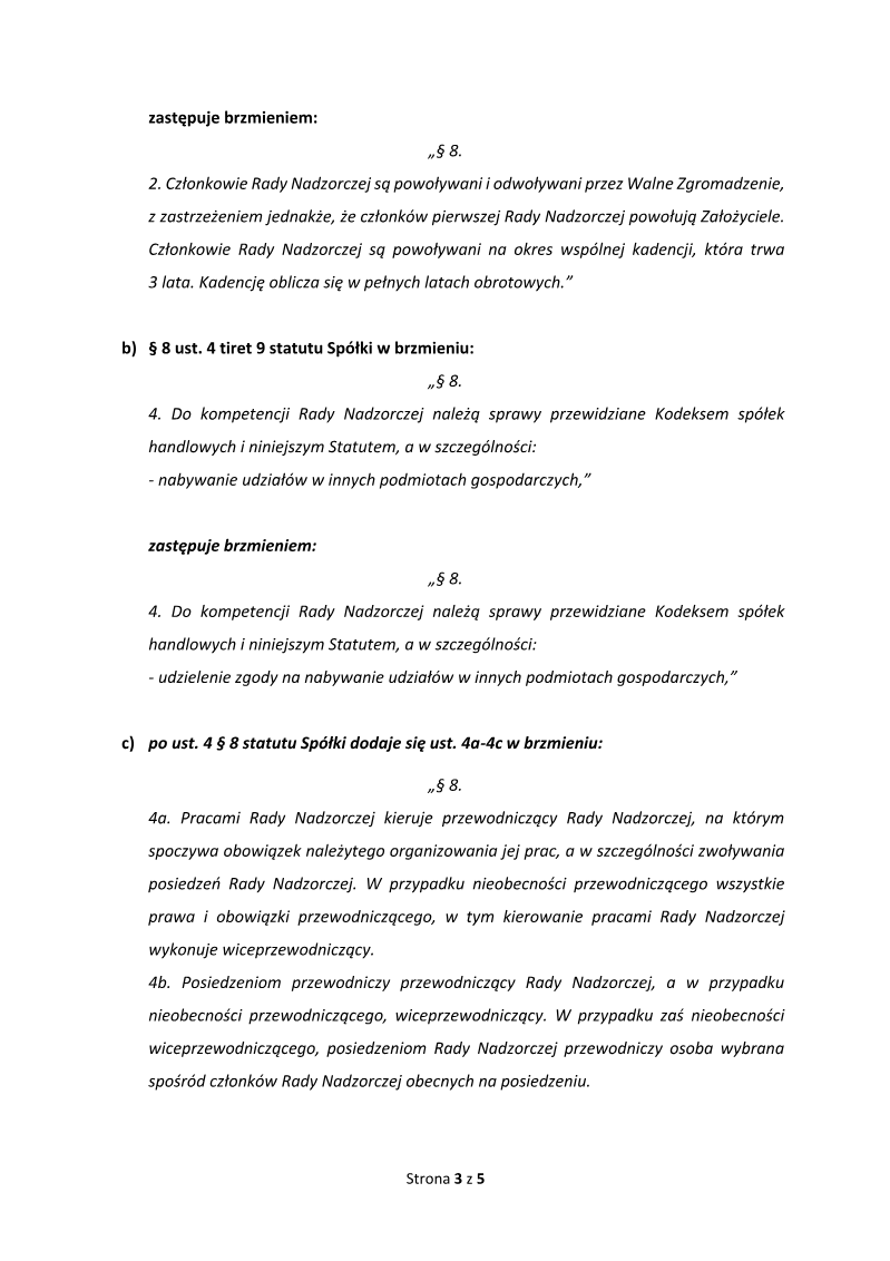 The corporate governance framework of the entity underwent significant structural revisions, specifically targeting the operational protocols of the General Meeting, the Supervisory Board, and the Management Board. These amendments reflect a transition toward modernizing administrative procedures and aligning with public company standards. A primary focus of the changes involved the location of General Meetings, which were previously restricted to the company’s headquarters or the seat of the stock exchange operator should the company become public. This indicates a strategic preparation for potential or existing public market participation. The Supervisory Board's composition and procedural flexibility were also central to these updates. Prior to the changes, the board was fixed at five members and operated under strict meeting protocols. The previous regulations allowed for remote voting and written resolutions, provided all members were notified of the draft content, but maintained specific restrictions on voting via proxy for matters introduced during a meeting or for the election of the Chairperson. Furthermore, the board held the explicit authority to select the statutory auditor for financial statements, a standard oversight function that has been refined through these statutory modifications. Administrative timelines and reporting obligations were also streamlined, notably through the removal of specific clauses regarding the Management Board's reporting window. Previously, the Management Board was required to submit an annual activity report to the Supervisory Board within three months of the fiscal year's end. By documenting these previous versions of the statutes, the entity establishes a clear legal baseline for its evolving governance structure, ensuring compliance with the Commercial Companies Code while adapting its internal regulations to better suit the demands of the contemporary corporate and regulatory environment.