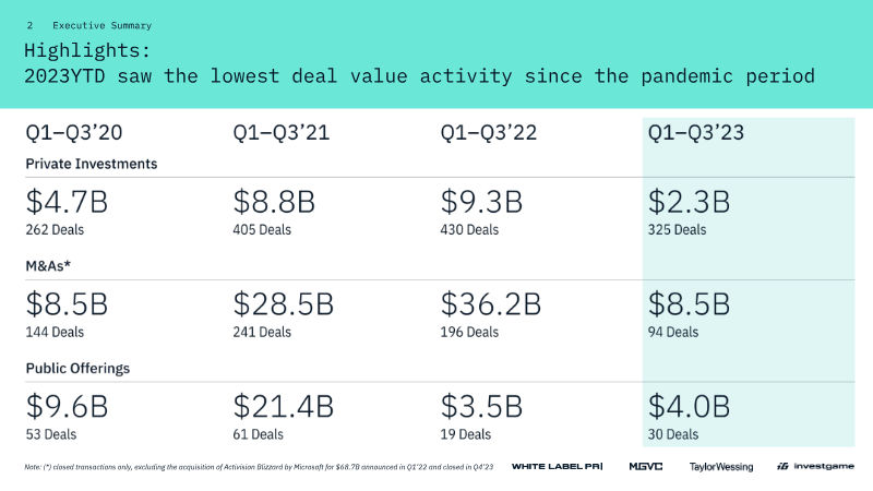 The 2023 Gaming Deals Report evaluates investment activity across the video‑game sector from 2020 through 2023, aiming to clarify how capital flows and transaction structures have reshaped the industry. By aggregating private‑equity, venture‑capital, and merger‑and‑acquisition data, the analysis demonstrates a pronounced shift from early‑stage financing toward large‑scale consolidation, while also tracking the emergence of artificial‑intelligence (AI) applications within game development and publishing. Overall capital raised by private‑equity and venture‑capital funds peaked at $12.1 billion in 2021 before retreating sharply to $2.7 billion in 2023, reflecting a contraction in early‑stage funding. The number of such deals followed a similar pattern, falling from a high of 567 in 2021 to 403 in 2023. In contrast, M&A activity accelerated dramatically, with closed‑deal value more than doubling from $40.8 billion in 2022 to $78.2 billion in 2023, even as the count of transactions remained modest. This divergence indicates that larger players are pursuing strategic acquisitions to capture market share and talent, while smaller firms face tighter financing conditions. AI‑related transactions, though still a niche segment, have shown a steady upward trajectory, with the cumulative count of closed AI deals rising from single‑digit figures in 2020 to over twenty in 2023. The report characterizes AI’s role as evolutionary rather than disruptive, suggesting that developers are integrating machine‑learning tools to enhance production efficiency and player experiences without fundamentally overturning existing business models. Collectively, the findings portray a gaming ecosystem in which capital concentration is intensifying, consolidation is accelerating, and emerging technologies are being incrementally adopted. Stakeholders are advised to monitor the narrowing gap between early‑stage funding and large‑scale M&A, as well as the growing relevance of AI, to anticipate future competitive dynamics.