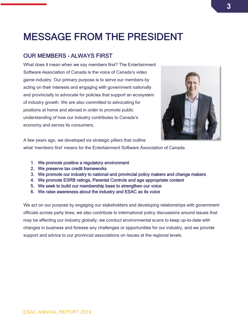 The 2024 Annual Report for the Entertainment Software Association of Canada (ESAC) outlines the organization’s strategic achievements in advocacy, regulatory affairs, and industry promotion during a period of significant legislative activity. The primary thesis emphasizes the industry’s resilience and its successful efforts to secure exemptions from restrictive Canadian regulations, specifically the Online Streaming Act and the Online Harms Act. By demonstrating the efficacy of existing self-regulatory tools like the ESRB rating system and parental controls, ESAC successfully argued that video games differ fundamentally from traditional broadcasting and require distinct policy considerations. Geographically focused on Canada with a global collaborative scope, the report highlights the industry’s substantial economic footprint, contributing $5.5 billion to Canada’s GDP. Key data points from the "Power of Play" survey, which sampled 13,000 players across 12 countries, reveal the social and emotional drivers of gaming in Canada. Findings show that 74% of Canadians play for fun, while 76% use games to reduce stress and 63% to lower anxiety. Furthermore, 46% of Canadian respondents engage in online multiplayer experiences, with 66% reporting positive social interactions. The report details ESAC’s expanded influence through the addition of major global members, including Epic Games, Roblox, and Tencent. It also reviews international engagement through the Global Video Game Coalition and the hosting of the Global Video Game Associations Policy Summit in Montreal. While celebrating these successes, the analysis notes ongoing challenges, such as amendments to the Invest in Canada Act that may restrict foreign investment. Methodologically, the report relies on member surveys, economic impact studies, and case studies to advocate for the "transformative power" of games in sectors like education, healthcare, and physical therapy. Financially, ESAC reports a strong position, benefiting from increased membership revenue and a virtual operating model.