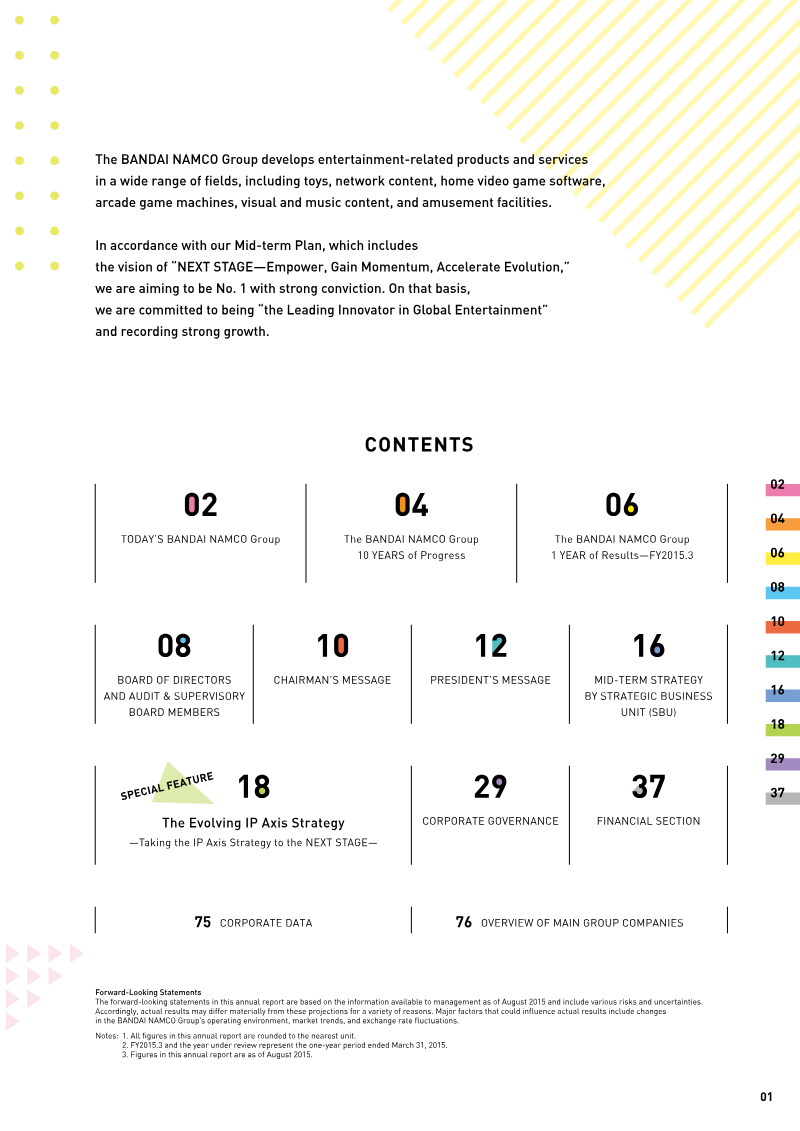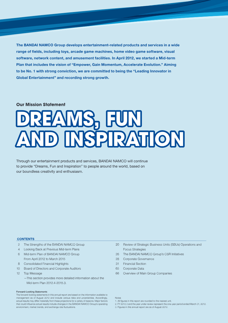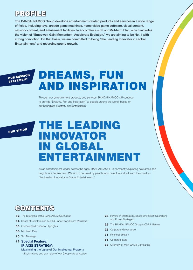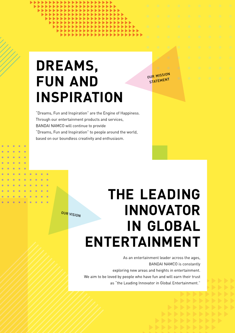FUN AND OUR MISSION “Dreams, Fun and Inspiration” are the Engine of Happiness. Through our entertainment products and services, BANDAI NAMCO will continue to provide “Dreams, Fun and Inspiration” to people around the world, based on our boundless creativity and enthusiasm. As an entertainment leader across the ages, exploring new areas and heights in entertainment.