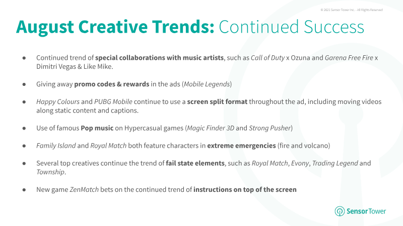 The August 2021 creative roundup highlights a pronounced shift toward human‑like characters and narrative‑driven formats across mobile‑gaming advertisements. Campaigns for titles such as Garena Free Fire, Call of Duty, Clash of Clans and Mobile Legends foreground anthropomorphic protagonists in both gameplay footage and cinematic sequences, often pairing them with real‑world personalities—DJs Dimitri Vegas & Like Mike and singer Ozuna appear as playable avatars, reinforcing a crossover appeal between music and gaming audiences. Anniversary celebrations and special collaborations dominate the thematic landscape, with multiple brands deploying party‑style visuals, event‑specific soundtracks and promotional codes to drive engagement. Split‑screen designs that juxtapose moving video with static captions recur in hyper‑casual and match‑3 ads, while fail‑state cues and “try‑it‑yourself” calls‑to‑action appear in titles such as Royal Match, Evony and Township, encouraging immediate interaction. Pop music, ranging from mainstream hits to instrumental versions of Rihanna’s “Desperado,” underpins many creatives, particularly on Snapchat and TikTok‑adjacent platforms. Performance data show these assets ranking within the top‑10 positions on networks including Instagram, YouTube, Snapchat, Facebook and ad‑exchange partners such as ironSource and Chartboost. The analysis draws on a sample of the highest‑performing creatives across these channels during August 2021, encompassing a broad geographic spread and covering genres from battle‑royale and hyper‑casual to match‑3 and simulation. The findings suggest that narrative depth, celebrity integration, and music‑driven emotional hooks are now core drivers of ad effectiveness in the mobile‑gaming market.