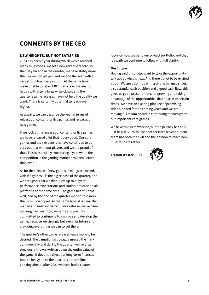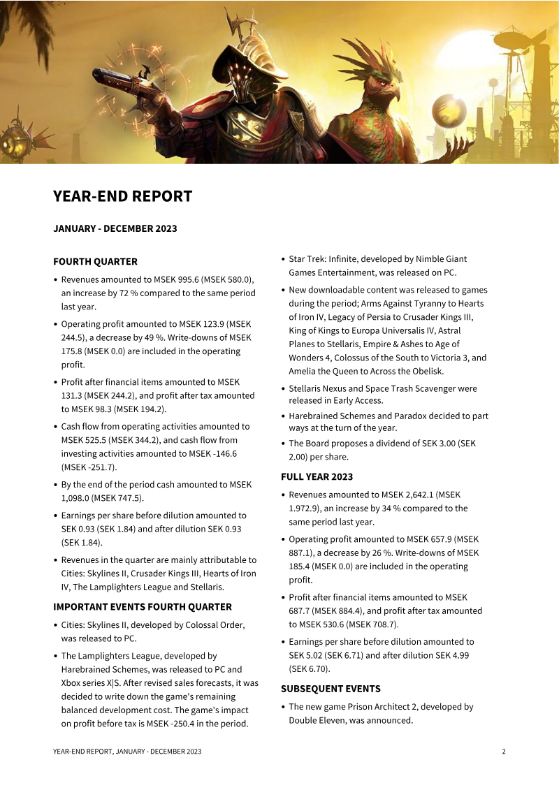 The presentation delivers CD Projekt Group’s fiscal‑year‑2023 financial performance and strategic outlook, emphasizing the company’s continued growth as a leading developer and publisher of interactive entertainment. It outlines revenue generation, profitability, cash‑flow dynamics, and the pipeline of upcoming titles, while recommending a dividend payout of PLN 99.9 million at a rate of one złoty per share. Revenue rose 29 percent to PLN 1.23 billion, driven by a 36 percent increase in product and service sales to PLN 1.04 billion. Gross profit improved 20 percent to PLN 849.6 million, while operating expenses grew 15 percent to PLN 331.9 million, yielding EBIT of roughly PLN 376.7 million. Net profit reached PLN 346.5 million, supporting a net‑profit margin near 28 percent. Cash, deposits and Treasury bonds increased by PLN 218.5 million, ending the year at PLN 1.31 billion, and total assets rose 15 percent to PLN 2.61 billion with equity up 18 percent to PLN 2.40 b
