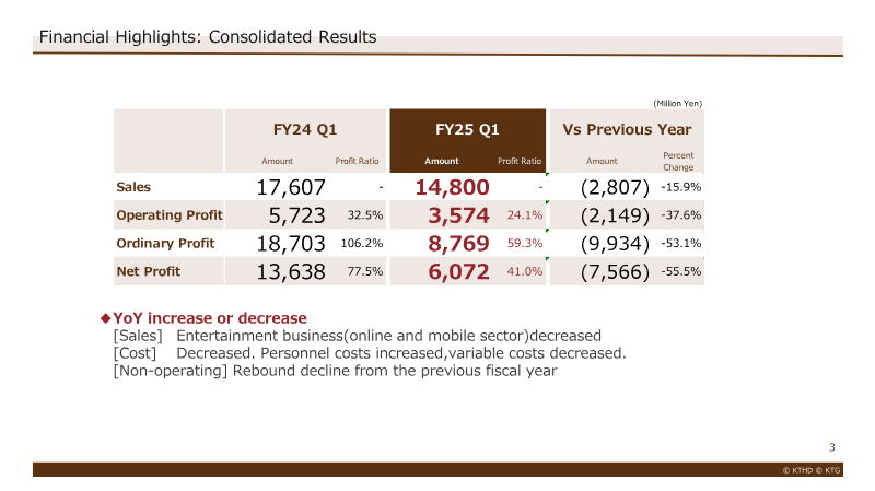 The primary aim of the presentation is to convey KRAFTON’s financial performance and strategic direction for its PUBG intellectual property and related franchise initiatives during the first quarter of 2025. Consolidated results prepared under Korean IFRS show record quarterly revenue of KRW 874.2 billion, a 31.3 percent increase year‑on‑year, driven by strong growth across PC, mobile and console platforms. Operating profit reached KRW 457.3 billion, up 47.3 percent YoY, while adjusted EBITDA rose to KRW 505.1 billion, reflecting a 33.4 percent improvement. Net profit improved modestly to KRW 371.5 billion (+6.6 percent YoY) but fell 24.4 percent quarter‑on‑quarter due to foreign‑exchange effects and higher non‑operating expenses. Platform‑level analysis reveals mobile revenue of KRW 532.4 billion, up 32.3 percent YoY and 47.0 percent QoQ, while PC revenue climbed to KRW 323.5 billion, a 32.8 percent YoY rise. Console contributions increased 14.2 percent YoY to KRW 13.1 billion. The “Others” category declined sharply, falling 39.2 percent YoY, indicating a shift toward core PUBG services. Personnel costs grew 22.2 percent YoY, reflecting expanded development and publishing activities. Strategically, KRAFTON emphasizes expanding the PUBG franchise through new titles across diverse genres, including a life‑simulation spin‑off and an extraction‑RPG, with early‑access releases targeting 1 million copies sold within a week. The company is integrating advanced AI features such as on‑device language models to enhance gameplay, and it is strengthening its publishing foothold in India via collaborations on the BGMI platform and acquisition of a leading cricket game IP. These initiatives aim to sustain long‑term fan engagement, diversify revenue streams, and position PUBG as a globally influential, evergreen IP.