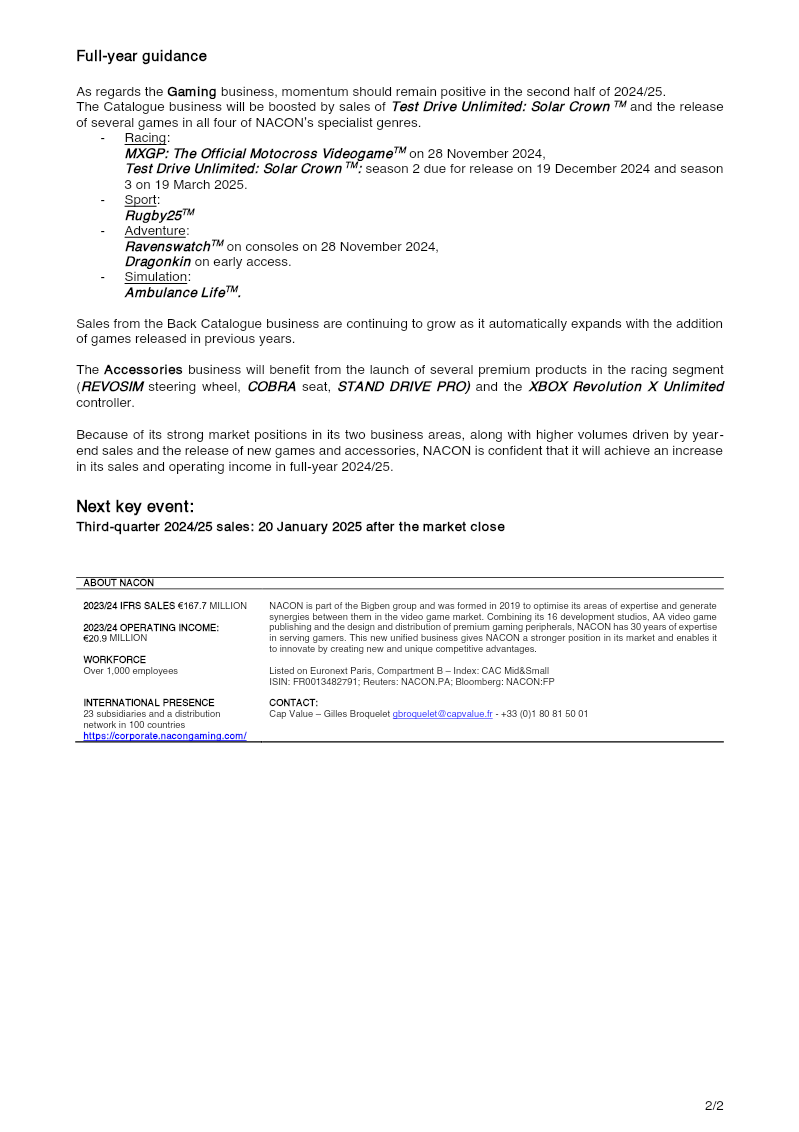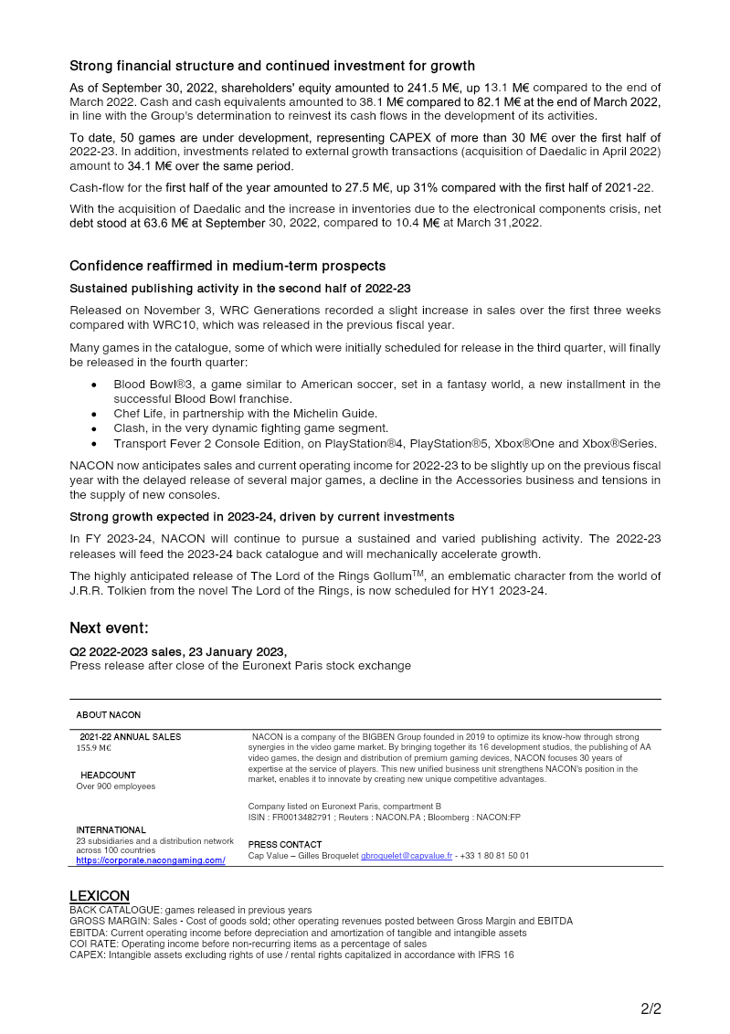 Nacon’s financial results for the first half of the 2023/24 fiscal year, covering the period from April 1 to September 30, 2023, reflect a transitional phase characterized by a back-weighted release schedule. Total IFRS sales reached €67.8 million, a decline from €77.5 million in the previous year. This decrease was primarily driven by a 9% drop in new game sales due to a limited release calendar during the first six months. Despite lower top-line revenue, the company achieved a significant improvement in margin rates, with EBITDA rising 20.1% to €29.3 million and the EBITDA margin expanding from 31.4% to 43.2%. The publishing segment saw resilient back-catalogue performance, contributing €21.2 million, while the accessories division generated €24.9 million. Accessories experienced a late-period surge attributed to the expanding installed base of current-generation consoles. However, operating income fell 62.7% to €3.7 million, largely due to a substantial increase in depreciation and amortization charges related to non-current assets, which rose to €25.6 million. Net income for the period was €3.2 million, impacted by higher interest rates and unfavorable foreign exchange fluctuations. Management maintains a positive outlook for the full fiscal year, anticipating strong growth in both sales and operating income. This optimism is supported by a robust second-half pipeline featuring over ten new titles, including the successful launch of RoboCop: Rogue City and the upcoming Test Drive Unlimited: Solar Crown. With 50 games currently in development and a carrying value of €118.1 million in related assets, the company is leveraging its 16 internal studios and new premium peripherals, such as the Revolution 5 Pro controller, to drive performance through the remainder of the year.