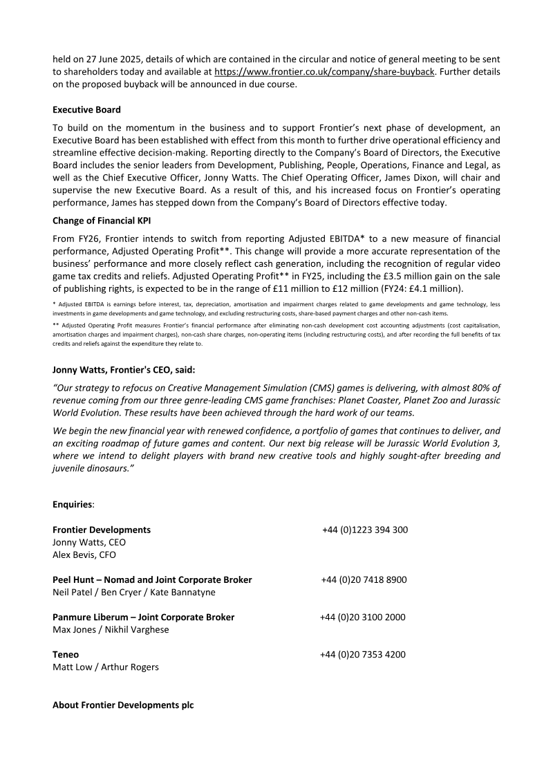 FY24 FINANCIAL RESULTS – RESET AND BACK ON TRACK Frontier Developments plc (AIM: FDEV, ‘Frontier’, the ‘Company’, or the ‘Group’), a leading developer and publisher of video games based in Cambridge, UK, publishes its full-year results for the 12 months ended 31 May 2024 (‘FY24’). This announcement contains inside information.