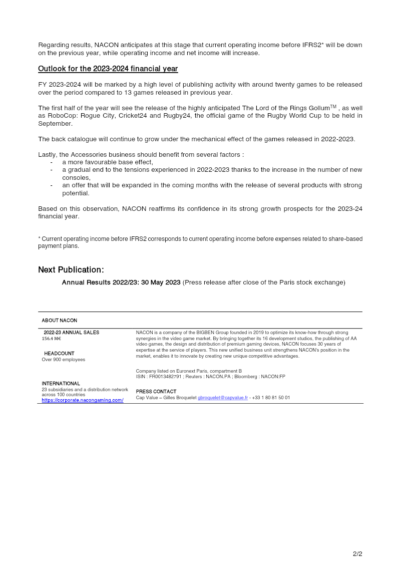 NACON reported full‑year 2024/25 results that show stable sales of €167.9 million, unchanged from the prior year, with a 64.4 % gross margin up from 62.1 %. EBITDA before non‑recurring items held steady at €55.9 million, while operating income fell sharply to €1.1 million due to a reversal of earn‑out provisions and increased depreciation from the Test Drive Unlimited release. Net income swung to a loss of €1.3 million, compared with a profit of €17.5 million in 2023/24, largely driven by the non‑recurring reversal of €14.2 million and a higher interest expense linked to rising bank rates. Equity rose to €284.4 million, supported by a July 2024 capital increase, and cash increased to €29.3 million. The company’s portfolio includes 40 games in development, with a carrying value of €124.5 million, and an accessories business that generated €65.2 million in sales. New peripherals such as the XBOX Revolution X Unlimited controller and the REVOSIM steering wheel range have been launched, targeting both console and PC markets. Looking ahead to 2025/26, NACON anticipates strong growth beginning in the first half of the year. The release calendar features 15 new titles across adventure, sport, racing and simulation genres, including high‑profile titles like Robocop: Rogue City – Unfinished Business and Hell is Us. A new World Rally Championship licence will grant exclusive publishing rights on PC and consoles from 2027 to 2032. With a robust product pipeline, continued innovation in peripherals, and disciplined financial management, NACON projects increased business levels and operating income for the upcoming fiscal year.