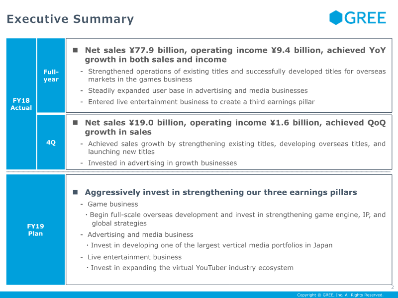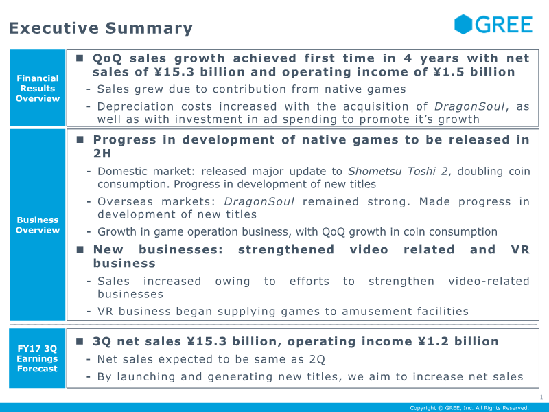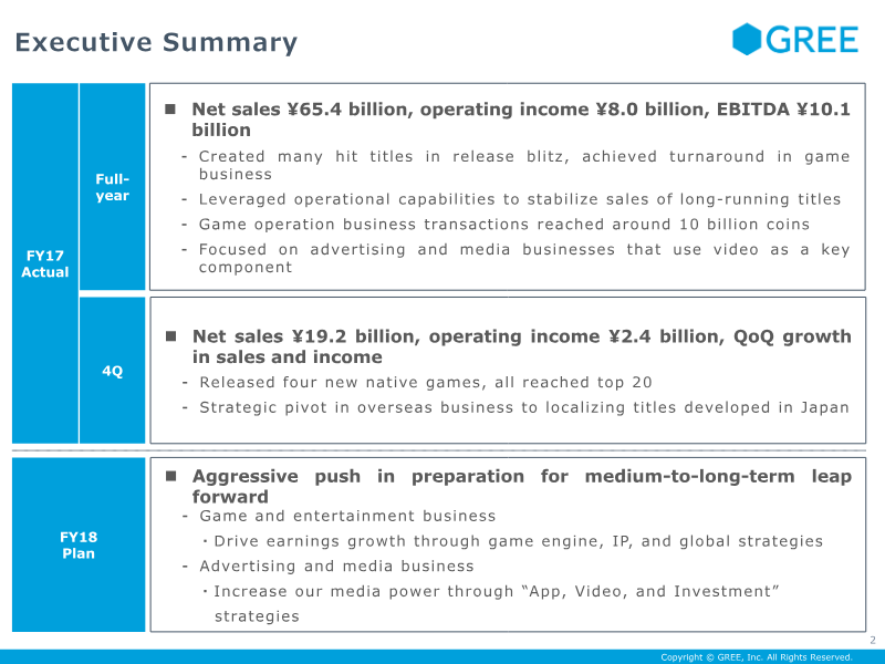 GREE, Inc. reported its fiscal year 2017 fourth-quarter results, highlighting a successful turnaround of its game business and a strategic shift toward global distribution. For the full year, the company achieved net sales of ¥65.4 billion and an operating income of ¥8 billion. The fourth quarter saw quarter-on-quarter growth with ¥19.2 billion in net sales and ¥2.4 billion in operating income, driven by the successful launch of four native games—including Another Eden and SINoALICE—all of which reached the top 20 rankings. A primary finding is the completion of a strategic pivot in overseas operations. The company decided to close international subsidiaries and consolidate all game development within Japanese studios to focus on global distribution. This transition resulted in a one-time extraordinary loss of approximately ¥6 billion due to asset write-downs and closure costs. Despite these charges, the company restored a double-digit operating income margin and reported that native games now account for more than half of total coin consumption, which reached a target of 10 billion coins. The outlook for fiscal year 2018 emphasizes a medium-term growth strategy centered on three pillars: game engines, intellectual property (IP), and global distribution. By reusing technical bases across different titles, the company aims to reduce development costs and increase investment in content quality. The pipeline includes six approved titles, with a focus on balancing first-party, co-developed, and third-party IPs. Additionally, GREE plans to expand its advertising and media business as a second major earnings pillar, focusing on high-retention apps and video production. While net sales are forecast to grow to ¥20.5 billion in the next quarter, operating income is expected to decline temporarily due to aggressive front-loaded investments in marketing and promotion to ensure long-term sustainability.