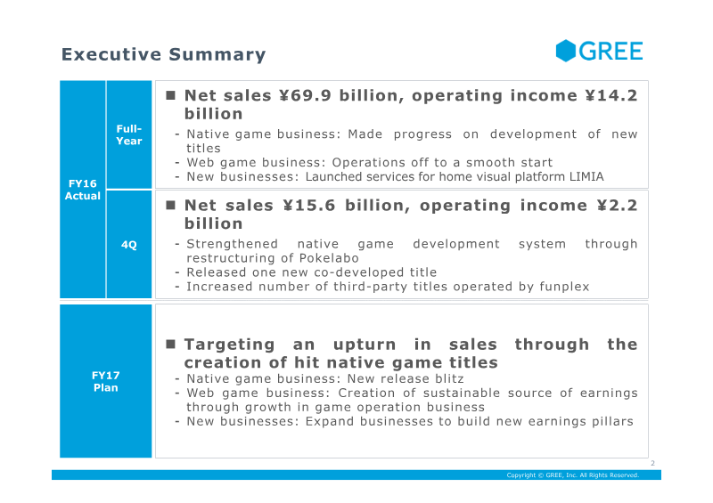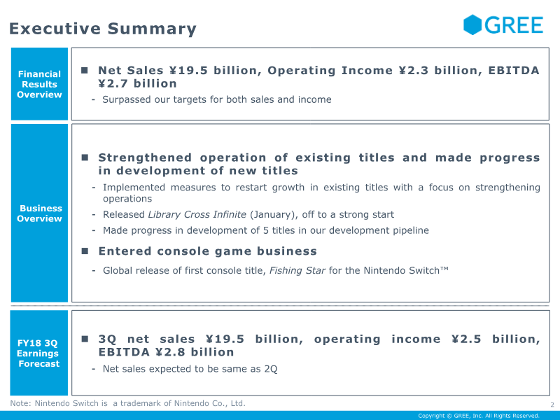 The quarterly results demonstrate a robust first‑quarter performance for FY2018, with net sales reaching ¥21.6 billion and operating income of ¥2.7 billion, reflecting a 17.1 % year‑over‑year increase and a 25 % quarter‑on‑quarter rise in sales. EBITDA stood at ¥3.1 billion, up from a negative figure the previous quarter, underscoring improved profitability after a sharp rebound in operating income. The company attributes growth to full‑scale operation of existing hit titles, aggressive media investment, and the launch of a new title in October. Advertising spend surged to ¥2.33 billion, driven by media‑operations expansion and promotional activities such as TV commercials, while labor costs fell due to overseas base closures. Financial forecasts for the first half of FY2018 project net sales of ¥40.5 billion and operating income of ¥4.5 billion, assuming a temporary dip in sales from mature titles and conservative earnings targets for new releases. The company plans continued investment in advertising to support high‑growth business segments. Operationally, the native game portfolio expanded from one released title to five in development, including first‑party and third‑party IPs. Existing titles received major updates and large‑scale collaborations, boosting coin consumption to 15 billion units in the quarter. The advertising and media arm reported a 2.4× QoQ increase in page views, driven by the LIMIA app’s growth to over one million monthly active users. Geographically, revenue is split between domestic and overseas markets, with overseas operations contributing a growing share of sales. The company’s headcount totaled 1,424 employees across game entertainment, advertising, and corporate functions. Overall, FY2018 Q1 results indicate strong top‑line momentum, improved profitability, and a strategic focus on expanding both domestic and international market presence.