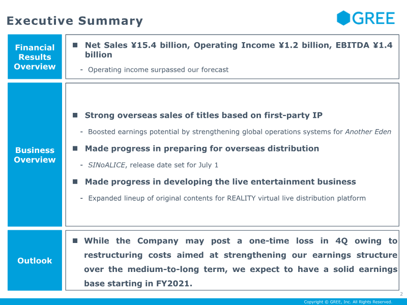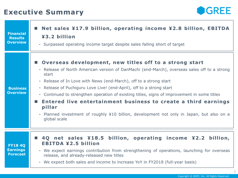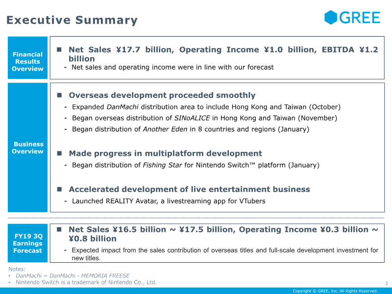 GREE’s financial results for the third quarter of fiscal year 2019 reflect a period of strategic transition, characterized by a shift toward overseas self-distribution and improved operational efficiency. The company reported net sales of ¥17.6 billion and an operating income of ¥1.6 billion, which surpassed internal forecasts. While overall net sales saw a slight year-over-year decline, operating income grew significantly compared to the previous quarter. This profitability was driven by a reduction in fixed costs, specifically through the streamlining of outsourcing and operational expenses, which offset a decline in legacy web-based games. The geographic scope of the results highlights a successful push into international markets. The self-distribution of first-party intellectual property, notably Another Eden, saw a strong start in eight countries and regions. Additionally, global simultaneous collaboration events for DanMachi contributed to increased daily active users and revenue. The company’s mobile game segment remains the primary revenue driver, accounting for ¥13.65 billion of total sales, while the advertising and media segment contributed ¥3.99 billion. Looking ahead to the fourth quarter of FY2019, the company forecasts net sales between ¥17.0 billion and ¥18.0 billion. This outlook is supported by a development pipeline of five mobile titles and the planned launch of AFTERLOST in the Shoumetsu Toshi series. Beyond gaming, the company is expanding its live entertainment ecosystem through the REALITY VTuber app and strengthening its media potential via its LIMIA and ARINE platforms. As of March 31, 2019, the company maintains a strong balance sheet with ¥86.3 billion in cash and equivalents and a consolidated headcount of 1,693 employees.
