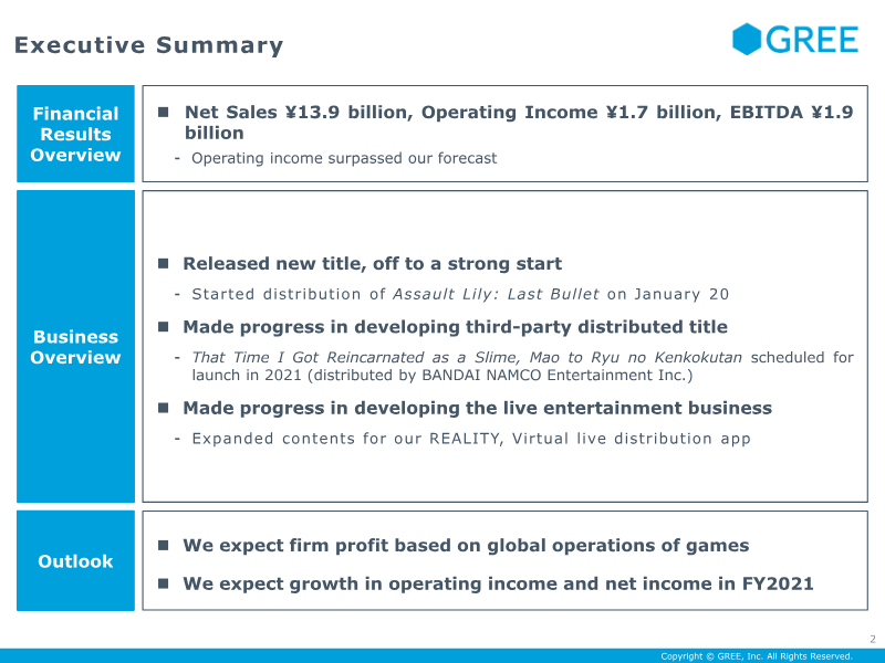 GREE’s financial results for the first quarter of fiscal year 2021, ending September 30, 2020, indicate a period of significant profitability driven by global expansion and optimized cost structures. The company reported net sales of ¥15.2 billion and an operating income of ¥1.6 billion, which surpassed internal forecasts. This financial recovery follows a loss in the previous quarter and was supported by a 9.4% reduction in total costs, falling to ¥13.6 billion. Key drivers for this improvement included a decrease in fixed costs due to business restructuring and lower advertising expenses following the conclusion of major anniversary events. The operational focus centered on the "Game engine, IP, and global" strategy. A primary highlight was the July 1 global launch of SINoALICE across 139 countries and territories, which significantly boosted overseas earning potential. The company also made strategic inroads into the Chinese market with the release of DanMachi in late September and preparations for the November launch of Another Eden. Beyond gaming, the company expanded its Live Entertainment segment through the REALITY virtual distribution app and strengthened its advertising and media reach, with the aumo platform exceeding 10 million monthly users. Looking ahead, the company maintains a robust development pipeline, planning to release two to three in-house titles annually, including upcoming projects like Heaven Burns Red and a Knights of Sidonia game. To enhance shareholder value, the company announced a significant stock repurchase program of up to 20 million shares, valued at approximately ¥12.0 billion, to be executed through September 2021. The overall outlook remains firm, predicated on the continued stabilization of coin consumption in existing titles and the scaling of global operations.