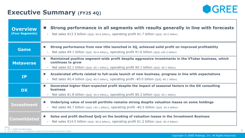 The briefing summarized GREE’s strategic focus for FY2019 and addressed investor inquiries about recent performance. The company reaffirmed its commitment to expanding the overall live entertainment market, emphasizing growth in both domestic and overseas game titles. In FY2019, GREE plans to roll out existing games internationally while pursuing new development projects, positioning itself to capture emerging markets. A key point of discussion was the goodwill impairment in the advertising and media segment, attributed to underperformance of the 3 Minutes unit. Despite this setback, management highlighted sustained growth across the advertising and media business, noting that it remains a sizable contributor to revenue. The company intends to continue investing in this area to accelerate expansion. The briefing also addressed the anticipated impact of 5G technology, with executives predicting that widespread adoption will drive demand for more creative gaming experiences. Consequently, GREE plans to enhance its development and creative capabilities to capitalize on the opportunities presented by faster connectivity. Investor interest in marketing tactics was reflected in questions about the television advertisement for SINoALICE. Management reported a positive outcome, citing record-high daily active users and strong retention rates following the campaign. Finally, the potential use of VTubers in future corporate promotion activities was acknowledged; GREE will evaluate audience response and consider incorporating VTubers again in upcoming events.