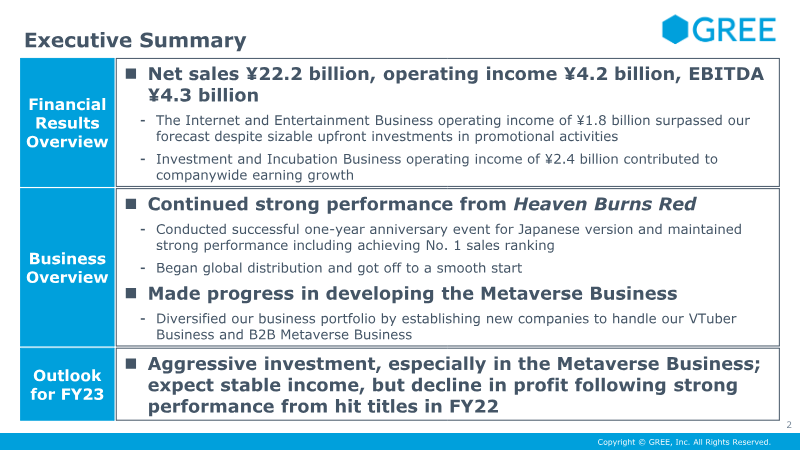 GREE reported FY 2023 third‑quarter results with net sales of ¥22.2 billion, operating income of ¥4.2 billion and EBITDA of ¥4.3 billion, reflecting a 15.7 % QoQ rise in sales and a 23.8 % YoY increase compared with the same period in FY 2022. Operating income grew 15.8 % QoQ, driven by the Internet and Entertainment Business (¥1.8 billion) and Investment and Incubation Business (¥2.4 billion). The company highlighted strong performance of its flagship title *Heaven Burns Red*, which achieved No. 1 sales rankings in Japan and several overseas markets following a one‑year anniversary event and aggressive promotional spending. Global distribution of the title began in February 2023, with Korean and traditional Chinese versions launching smoothly. Cost analysis shows advertising expenses rising to ¥3.08 billion QoQ, largely due to upfront promotional investments for app games, while commission fees increased to ¥4.11 billion as sales expanded. Total costs climbed by ¥3.08 billion QoQ to ¥17.93 billion. GREE’s investment arm maintained a total AUM of ¥75.0 billion, with FoF and CVC investments generating high long‑term returns (IRR 23 % for FoF, 20 % for CVC). The company’s dividend policy targets a consolidated payout ratio of at least 20 %, with a planned per‑share dividend of ¥11, consistent with the FY 2022 level. Geographically, operations span Japan, Korea, China, and North America, with the Metaverse Business expanding through REALITY XR cloud and VTuber talent agency FIRST STAGE PRODUCTION. The company projects stable FY 2023 income, acknowledging a potential profit decline following the strong FY 2022 hit‑title performance.