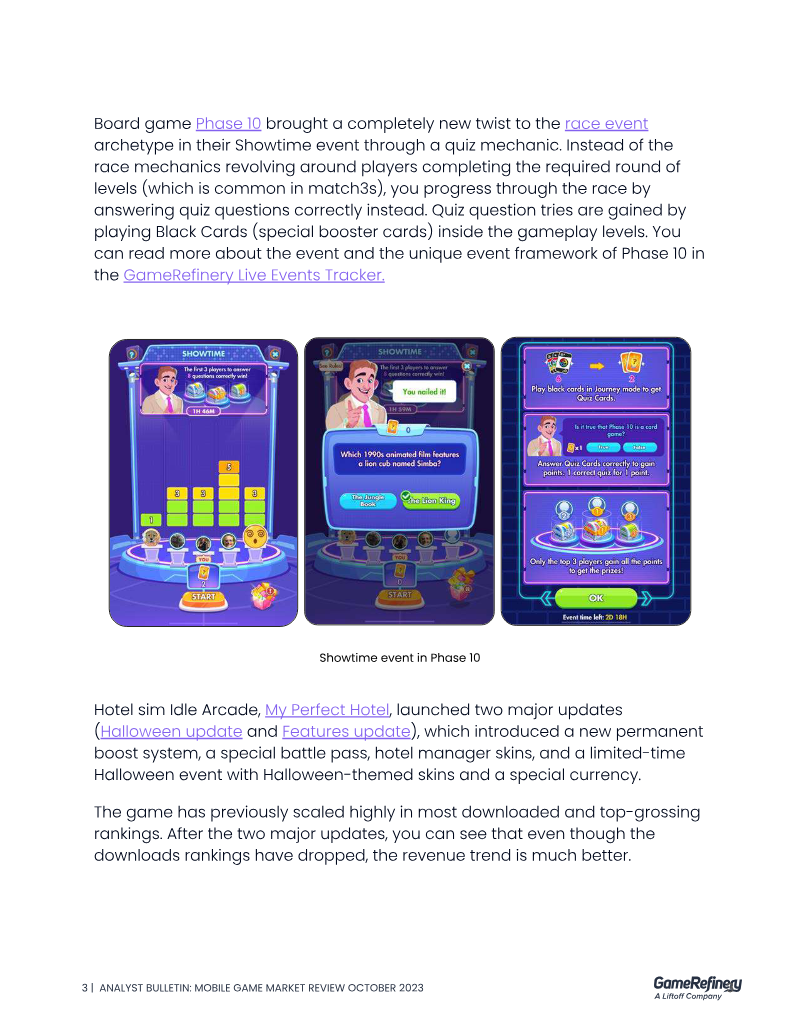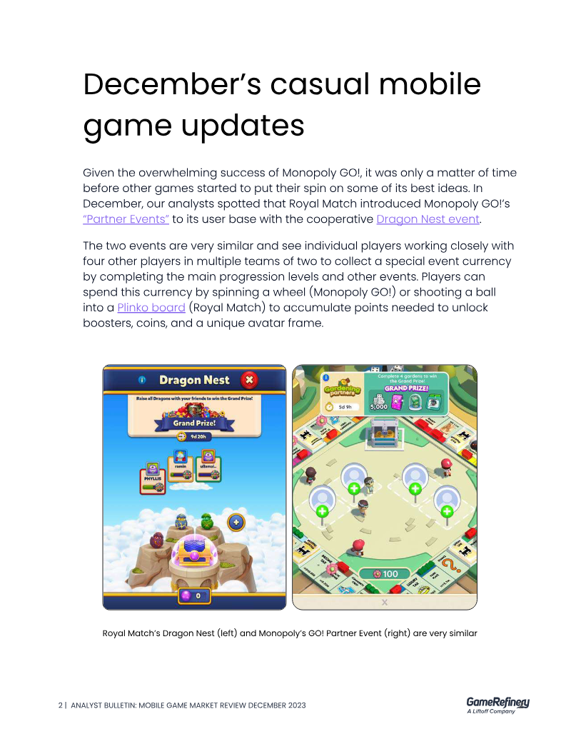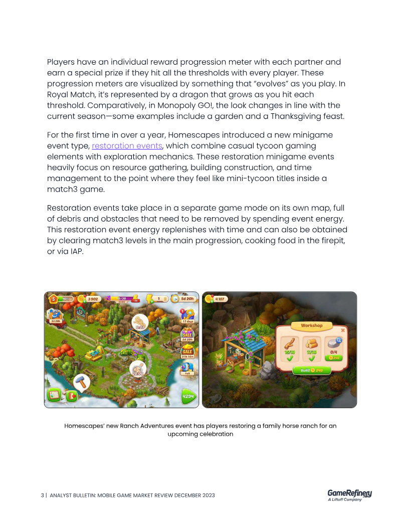 The mobile gaming market in November 2023 was characterized by the proliferation of specific event mechanics and the rise of the 3D match subgenre. Analysis of market leaders reveals that Royal Match has become a primary trendsetter for casual titles. Its "Social Win Streak" and "Digging Minigame" mechanics were widely adopted by competitors such as Monopoly GO!, Matchington Mansion, and BTS Island. Simultaneously, the success of Triple Match 3D spurred a wave of new entries in the 3D match category, including Match Factory and spin-offs from established franchises like Candy Crush. A significant shift occurred in the midcore segment, where developers increasingly experimented with pay-gated event content. Titles such as Free Fire, State of Survival, and Last Fortress: Underground implemented exclusive rewards and gameplay modes accessible only through direct purchases or premium currency top-ups. This trend suggests a strategic move toward more aggressive monetization of live events, moving away from purely engagement-based models to those requiring financial entry points for participation. Geographically, the US market saw major activity with the global launch of Warcraft Rumble, which achieved the top download spot and maintained a top-50 grossing position. In China, Soul Knight Prequel demonstrated the continued strength of the roguelite genre, reaching the top of the download charts. Other notable developments included the expansion of user-generated content via the Stumble Workshop in Stumble Guys and the rapid emergence of mobile clones inspired by the viral Nintendo Switch title, Suika Game. These findings indicate a highly reactive market where developers quickly iterate on successful mechanics and viral trends across both casual and midcore segments.