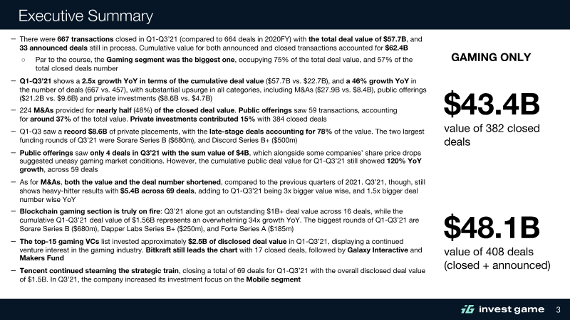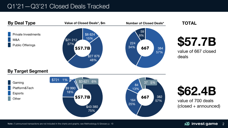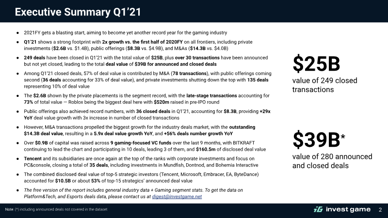 The first half of 2021 marked a period of unprecedented financial activity in the global video game industry, characterized by a fourfold increase in deal value compared to the same period in 2020. Total transaction value for closed deals reached $44.2 billion across 471 transactions, while the inclusion of announced deals brought the cumulative value to $50.2 billion. This surge was driven primarily by massive mergers and acquisitions and record-breaking public offerings, signaling a robust period of consolidation and capital influx across gaming, platform technology, and esports segments. Mergers and acquisitions emerged as the primary growth engine, totaling $22.4 billion in value. This figure surpassed the entirety of 2020, fueled by "mega-deals" such as Microsoft’s $7.5 billion acquisition of ZeniMax and ByteDance’s $4 billion acquisition of Moonton. Public offerings also reached an all-time high of $17.1 billion, supported by high-profile IPOs and direct listings from companies like Roblox, AppLovin, and Playtika. Private investments contributed $4.6 billion, with late-stage venture capital accounting for 65% of that total. Notable trends included a strategic shift toward PC and console targets in the M&A space and the rapid emergence of blockchain-powered gaming, which saw 24 deals exceeding $476 million. Geographically and strategically, Tencent maintained its dominant position by closing 53 deals, focusing heavily on PC and console studios. Other major players like Electronic Arts and Embracer Group aggressively expanded their portfolios through multi-billion dollar acquisitions. While the first quarter of 2021 saw the highest concentration of activity, the second quarter experienced a slight cooling in public markets as several newly listed companies faced share price declines. Data for these findings was compiled through a methodology tracking closed transactions via public media, business partnerships, and S&P Capital IQ, excluding pure gambling and betting entities.