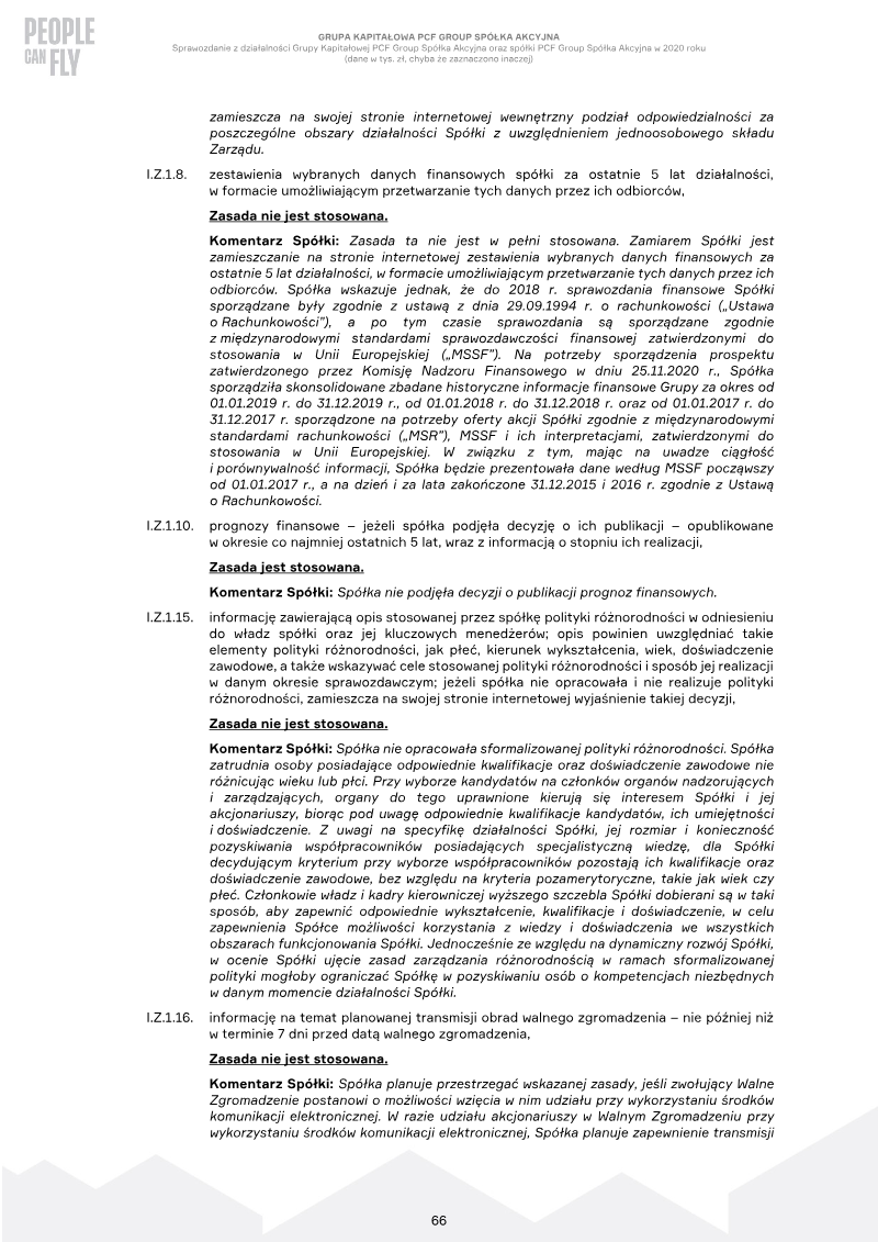 PCF Group S.A. maintains a framework of corporate governance that aligns with the majority of the Best Practice of GPW Listed Companies 2016, though it maintains several strategic deviations rooted in its organizational structure and recent transition to public markets. As of late 2020, the company’s governance model is characterized by a single-member Management Board, which precludes a formal division of responsibilities and centralizes risk management, compliance, and internal audit functions. Rather than establishing dedicated internal units for these oversight roles, the company relies on the direct supervision of the Management Board and the Audit Committee to ensure operational integrity. A significant area of non-compliance involves the absence of a formalized diversity policy. The company prioritizes merit-based recruitment and professional qualifications over specific gender or age targets for its governing bodies. Furthermore, technical and historical limitations impact transparency; the company does not provide real-time public broadcasts of General Meetings or a five-year historical financial data set in a processable format, citing its recent adoption of International Financial Reporting Standards as the primary cause for the latter. Regarding shareholder rights and executive compensation, the company adheres to statutory guidelines but bypasses certain optional recommendations. Notable exceptions include a share nominal value of 0.02 PLN, which is significantly lower than the recommended 0.50 PLN, and the lack of a dedicated compensation committee. While a formal remuneration policy is in place, stock-based incentives currently lack a minimum two-year vesting period. Despite these omissions, the company maintains standard protocols for managing conflicts of interest and ensures that significant related-party transactions follow established legal requirements, even in the absence of specific internal bylaws requiring additional Supervisory Board approval.