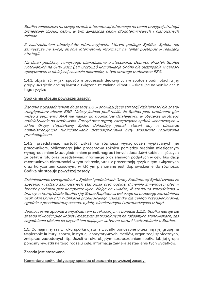 PCF Group S.A., operating as People Can Fly, maintains a high level of transparency and shareholder engagement while navigating the transition toward full compliance with the Best Practice for GPW Listed Companies 2021. As of early 2023, the AAA game developer adheres to the majority of governance standards regarding board independence, internal systems, and shareholder relations. The company facilitates electronic participation in general meetings and provides bilingual broadcasts to ensure accessibility for its investor base. While it recently established an internal audit function and committed to a five-year external audit cycle, certain gaps remain in formalized risk and compliance departments, which the company intends to address in future reporting cycles. The primary areas of non-compliance center on formalized ESG strategies and diversity policies. The company currently excludes environmental and social issues from its formal business strategy, arguing that its operations as a software developer have a relatively low environmental impact. Furthermore, the company has opted not to implement a structured diversity policy for its Management or Supervisory Boards, preferring to maintain flexibility in recruitment by prioritizing specialized professional qualifications over specific gender or age metrics. Despite the absence of a formal policy, the company emphasizes a commitment to gender pay equality and merit-based advancement. Regarding executive compensation and related-party transactions, the company follows established standards for transparency and oversight. Remuneration for the Supervisory Board remains independent of short-term financial results, and procedures are in place for external valuations of significant transactions. Although the company’s statutes do not currently require General Meeting approval for all related-party transactions, it maintains rigorous internal oversight through the Supervisory Board. These governance practices reflect a balance between meeting the regulatory expectations of the Warsaw Stock Exchange and maintaining the operational agility required in the competitive global gaming industry.