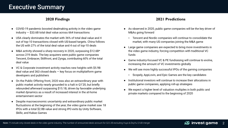 This analysis examines global investment and merger and acquisition (M&A) activity within the video game industry from 2020 through 2022. The primary thesis posits that the industry has passed a historic peak of deal-making and is now entering a "Great Reset" characterized by market cooling, lower valuations, and a shift in investor priorities. While the era of massive public offerings and late-stage venture capital (VC) surges has slowed due to macroeconomic headwinds like inflation and rising interest rates, the industry remains fundamentally strong with significant "dry powder" available for early-stage startups and strategic consolidations. The data reveals a volatile three-year cycle. M&A activity reached a zenith in 2022 with $37.7 billion in closed deals—a 199% increase in value from 2021—driven by massive consolidations such as Take-Two’s acquisition of Zynga. Conversely, public offerings plummeted by 82% in 2022 as the IPO and SPAC windows effectively closed. Private investments also saw a 16% decline in value in 2022 after doubling the previous year. Despite these drops, early-stage VC remained resilient, with over $6.2 billion raised by gaming-focused funds ready for deployment. Geographically and segmentally, the scope is global, with specific attention paid to the decline of mobile gaming hype post-IDFA and the rising interest in PC, console, and AI-driven startups. The report highlights a stark cooling in Web3 gaming, where investor "FOMO" has been replaced by a focus on fundamental gameplay and infrastructure. Gender diversity remains a challenge in the sector; 89% of funded or acquired companies were led by men in 2022, a negligible change from 90% in 2021. Methodologically, the findings are based on tracked closed transactions across video game publishers, developers, and hardware providers. Data was aggregated from public media, S&P Capital IQ, and partner insights, utilizing a weighted ranking system to identify the most active investors. The analysis concludes that while the "peak wave" has passed, the industry is transitioning into a more disciplined phase of the investment cycle.