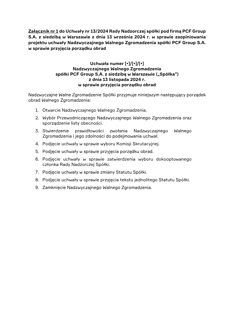 This document outlines proposed amendments to the Articles of Association for PCF Group S.A., a Warsaw-based public company. The primary objective of these changes is to restructure the corporate governance framework by centralizing appointment powers within the Supervisory Board and General Meeting, while simultaneously removing specific personal rights previously held by major individual shareholders and the Group of Authorized Shareholders. The proposed revisions to Section 13 eliminate the personal right of "Shareholder SW" to appoint the President of the Management Board, transferring all appointment and dismissal powers for Management Board members to the Supervisory Board. The amendments also redefine representation rules, requiring joint action by two board members in multi-person boards. Furthermore, a new provision in Section 14 introduces stricter oversight by requiring Supervisory Board approval for financial obligations exceeding 10% of the company’s equity and for any permanent disposal of intellectual property rights related to the company’s games. Significant changes to Sections 16, 18, and 21 focus on the Supervisory Board and its Audit Committee. The proposal removes the "Group of Authorized Shareholders" and their personal rights to appoint the majority of the Supervisory Board and specific members of the Audit Committee. Under the new terms, the General Meeting gains sole authority to appoint and dismiss all five to seven members of the Supervisory Board. These changes reflect a shift toward a more standardized governance model for a public interest entity, removing specialized shareholder privileges in favor of statutory collective decision-making processes.