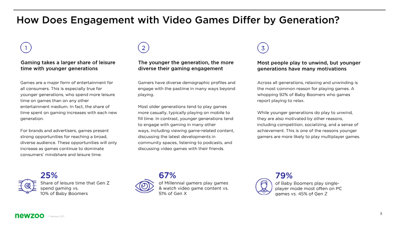 Gaming has evolved into the primary entertainment medium for younger generations, with 94% of Gen Alpha identifying as game enthusiasts. This shift signifies a transition from gaming as a solitary hobby to a multi-dimensional "way of life" that encompasses playing, viewing, and socializing. While mobile gaming maintains universal appeal across all age groups, younger cohorts like Gen Alpha and Gen Z are significantly more likely to engage across multiple platforms and participate in virtual social environments. These younger players demonstrate high spending conversion rates, with approximately 60% investing in games, often driven by a desire for social immersion and diverse genres such as Adventure and Battle Royale. In contrast, older generations like Gen X and Baby Boomers exhibit more utilitarian engagement patterns. These cohorts primarily favor casual puzzle-solving titles and are motivated by achievement, mastery, and time-saving mechanics. While 70% of younger players are "player-viewers" who consume gaming video content for entertainment and social connection, older players use video content more informationally, such as for reviews or tutorials. This generational divide extends to brand discovery; younger players are increasingly open to discovering new brands within game worlds, making the medium a vital marketing tool for reaching modern consumers. The global gaming landscape is characterized by both universal franchises and distinct regional preferences. Major titles like Call of Duty, Fortnite, and Genshin Impact maintain a massive international presence, yet markets such as China, Japan, and South Korea continue to support region-specific hits like Honor of Kings and Lineage. Across these diverse geographies, the 2023 data highlights that gaming has become a central pillar of social interaction and brand engagement, particularly as younger generations integrate virtual experiences into their daily identities and consumption habits.