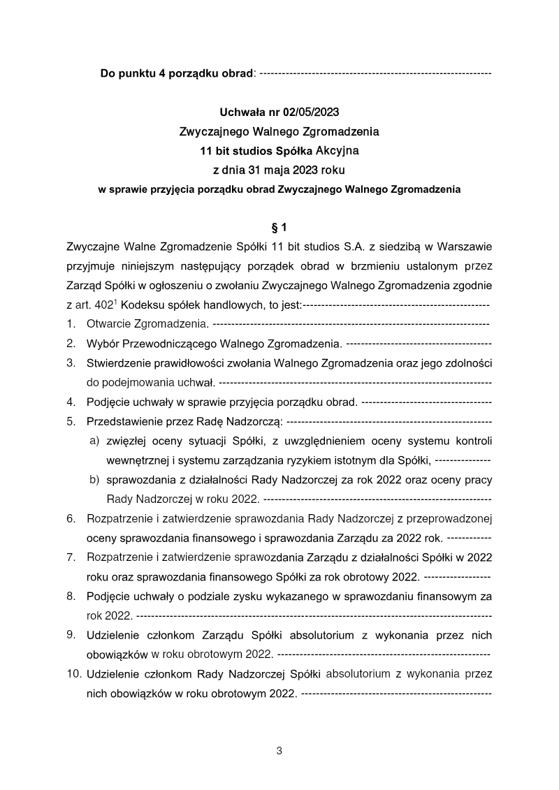 This notarial deed records the proceedings and resolutions of the Ordinary General Meeting of 11 bit studios S.A., held on June 30, 2011, in Warsaw. The primary purpose of the meeting was to conduct standard annual corporate governance tasks, including the review of the company’s initial operational period from its inception on December 7, 2009, through the end of the 2010 fiscal year. The meeting was attended by five shareholders representing 1,240,578 shares, which accounted for 66.31% of the company’s total share capital. Key financial findings disclosed during the session indicate that the company closed the 2010 fiscal year with a net loss of 231,199.53 PLN. The total balance sheet value as of December 31, 2010, was reported at 1,352,359.17 PLN. Shareholders formally approved the Management Board's report and the financial statements, subsequently passing a resolution to cover the accumulated loss using future profits. The assembly also focused on administrative and leadership oversight. Shareholders unanimously granted discharge (absolutorium) to all members of the Management Board—Grzegorz Miechowski, Bartosz Brzostek, Michał Drozdowski, and Przemysław Marszał—and the Supervisory Board for the performance of their duties during the 2010 period. Voting for these discharges was conducted via secret ballot, with relevant board members abstaining from votes concerning their own conduct as required by the Commercial Companies Code. The document concludes with the formal closing of the meeting after all agenda items, including the election of the Scrutiny Committee and the Chairman, were resolved without opposition.