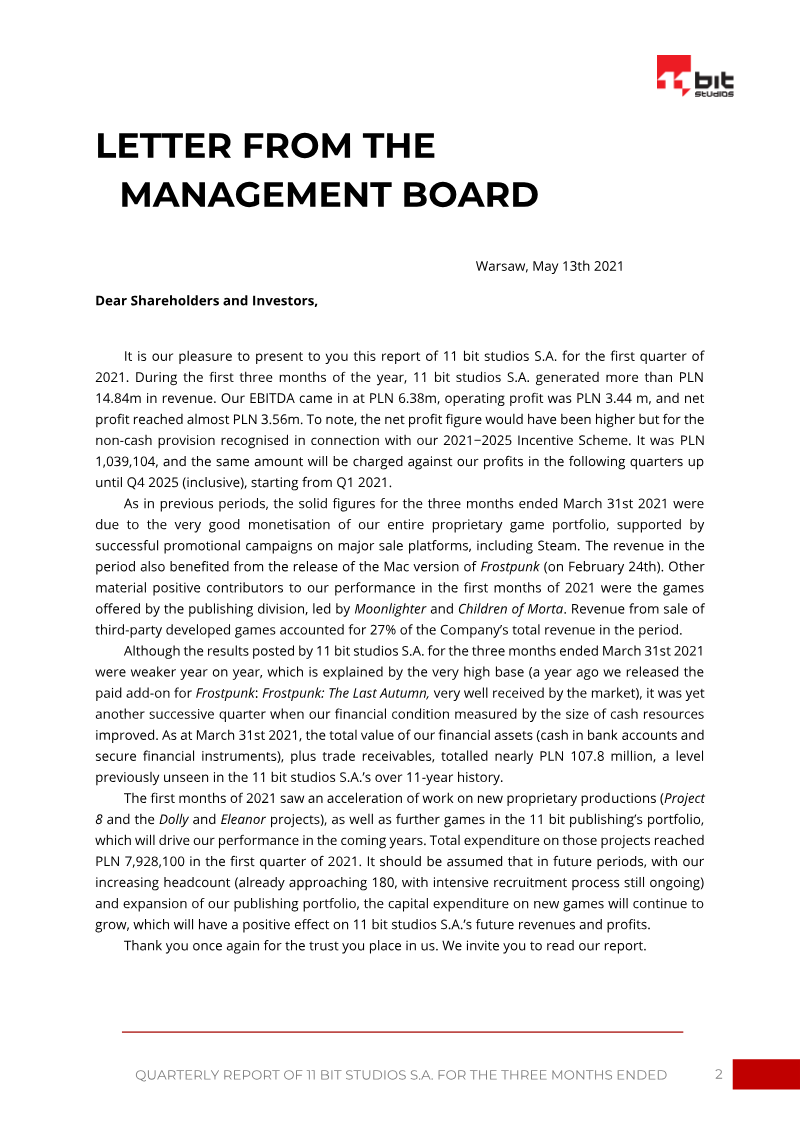 Financial performance for the first quarter of 2024 reflects a transitional period characterized by steady revenue growth alongside increased operational spending. Revenue rose 3.81% year-on-year to PLN 15.33 million, primarily supported by the publishing division, which contributed 48% of total sales through titles such as The Invincible and The Thaumaturge. Geographically, the United States remains the most critical market, accounting for nearly 74% of total revenue. Despite the top-line growth, the company shifted from a prior-year profit to a net loss of PLN 1.6 million. This decline was driven by a 25.88% increase in operating expenses, largely due to a near-doubling of employee benefits and significant ongoing investments in upcoming proprietary titles. The balance sheet remains robust, with total assets reaching PLN 265.15 million and a strong liquidity position of PLN 40.56 million in cash and equivalents. Capital expenditure focused heavily on development, with PLN 140.7 million currently invested in ongoing projects, most notably Frostpunk 2, The Alters, and Project 8. Internal assessments indicate no risk of impairment for these assets, even under conservative revenue scenarios. To preserve capital for these large-scale projects, management has recommended allocating the entirety of the 2023 net profit to statutory reserves rather than issuing dividends. Strategic focus is now directed toward the second half of 2024, which is expected to serve as a major growth catalyst. The upcoming high-profile launches of Frostpunk 2 and The Alters, both of which will debut on PC Game Pass, are central to the company’s medium-term goal of releasing one proprietary and several third-party titles annually. While the company continues to benefit from the "IP Box" tax relief and the successful break-even of indie titles like INDIKA, the long-term financial trajectory remains tied to the successful execution of its major internal development pipeline and the continued expansion of the Frostpunk intellectual property across multiple media formats.