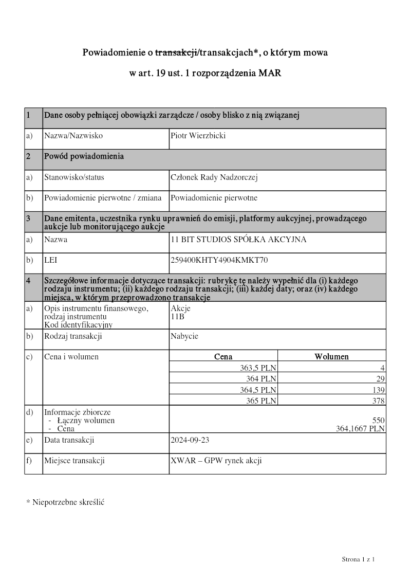 This regulatory disclosure details a significant insider trading event involving the leadership of 11 bit studios S.A., a prominent Polish game developer and publisher. The notification, issued in compliance with Article 19 of the Market Abuse Regulation, confirms the disposal of company shares by Fundacja Rodzinna Miechowskich. This entity is closely associated with Grzegorz Miechowski, a member of the company’s Management Board, who serves as the President of the foundation’s board. The transaction occurred within the context of the Warsaw Stock Exchange, where the company is publicly listed. While the summary report identifies the nature of the transaction as a sale, it emphasizes the legal necessity of transparency regarding actions taken by persons discharging managerial responsibilities and their related entities. Such disclosures are mandatory to ensure market integrity and provide investors with clear insight into the financial movements of key executives and their affiliated organizations. The scope of this notification is specific to the internal governance and capital structure of 11 bit studios S.A. as of October 2025. It reflects the ongoing regulatory obligations of European game industry entities to report changes in share ownership that could influence market perception or signal shifts in executive sentiment. The report was formally authorized by the President of the Management Board, Przemysław Marszał, and Board Member Marek Ziemak, fulfilling the company's transparency requirements under European Union financial regulations.