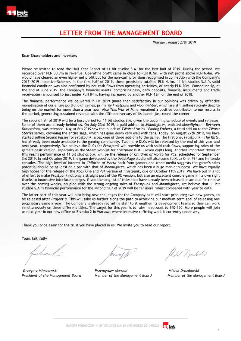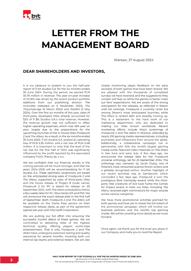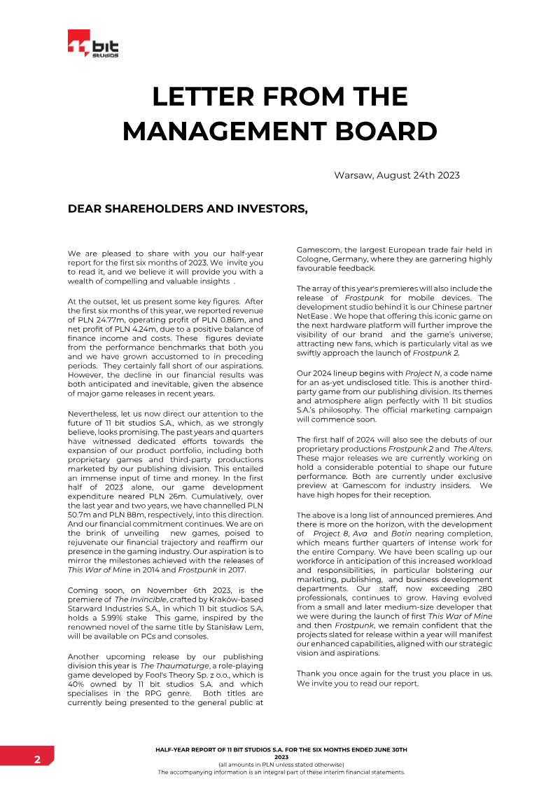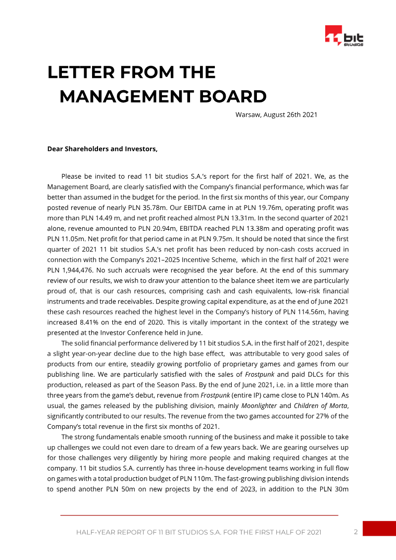 11 bit studios S.A. achieved a significant financial turnaround in the first half of 2025, reporting a net profit of PLN 8.48 million compared to a net loss in the same period of 2024. Revenue grew by 86% year-over-year to reach PLN 57.24 million, a surge primarily driven by the successful June launch of *The Alters* and recurring income from Microsoft Game Pass for *Frostpunk 2*. The United States remains the company’s most critical market, accounting for 78% of total revenue, while Steam serves as the primary distribution channel, representing over half of all sales. The company’s balance sheet remains stable with total assets of PLN 265.6 million, though cash reserves decreased to PLN 51.9 million due to heavy investment in intangible assets and property. Operating expenses rose to PLN 40.3 million, characterized by a fourfold increase in depreciation following the release of major titles. Notably, the company reduced the estimated cost of its 2021–2025 Incentive Scheme to zero, as it no longer expects to meet the ambitious five-year financial targets of PLN 656 million in revenue and PLN 328 million in pre-tax profit. Strategically, the studio is transitioning to a three-pillar model focused on internal IP development, long-term "platform games," and third-party publishing. Current development efforts are centered on the September 2025 console release of *Frostpunk 2*, the Early Access launch of *Moonlighter 2*, and the production of *Frostpunk 1886* using Unreal Engine 5. While the global gaming market shows growth potential, the company continues to manage risks related to unpredictable consumer demand, platform holder dependencies, and the competitive landscape for specialized development talent in Poland.