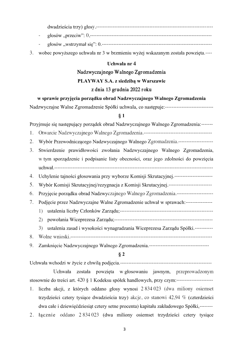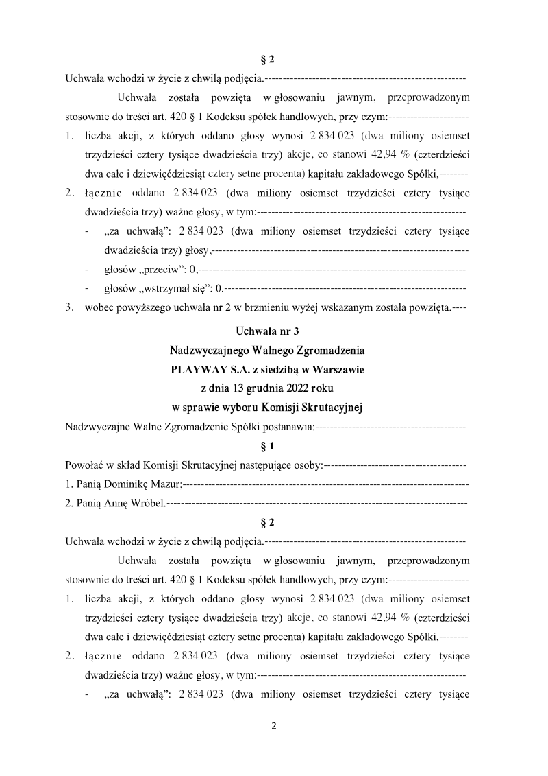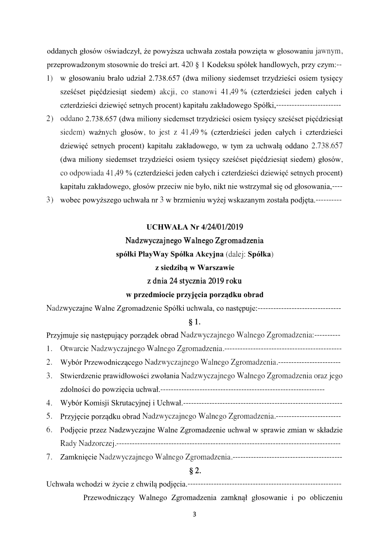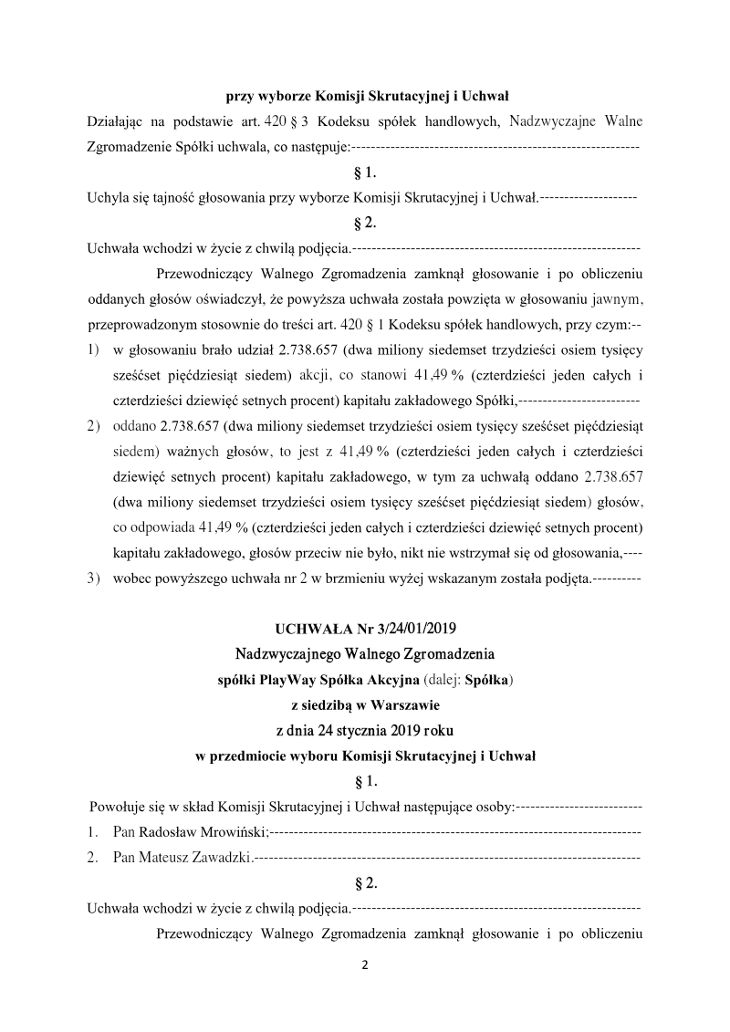 The Extraordinary General Meeting of PlayWay S.A., held on November 27, 2020, in Warsaw, resulted in the adoption of eight key resolutions governing the company’s corporate structure and asset management. The meeting saw high shareholder engagement, with participating shares representing approximately 84.6% of the total share capital. Beyond procedural appointments, the primary focus of the assembly was the strategic reorganization of specific intellectual property assets and the renewal of the company’s leadership mandates. A significant outcome of the meeting was the authorization to transfer organized parts of the enterprise to third-party entities. Resolution 4 approved the transfer of assets related to the mobile version of Car Mechanic Simulator 18 to Digital Melody Games. This transfer includes source code, intellectual property rights, and associated financial receivables. Resolution 5 granted the Management Board broad authority to transfer assets related to the Farm Manager franchise, specifically Farm Manager 2018 and the then-upcoming Farm Manager 2021. This authorization allows the board to negotiate terms, select third-party recipients, and potentially utilize these assets as non-cash contributions to other commercial companies. The assembly also addressed executive governance by reappointing the core leadership team for a new term. Krzysztof Kostowski was unanimously confirmed as President of the Management Board, and Jakub Władysław Trzebiński was reappointed as Vice President. Additionally, the Supervisory Board was expanded or amended through the appointment of Lech Klimkowski, a candidate proposed by shareholder ACRX Investments Limited. These resolutions ensure continuity in PlayWay’s management while facilitating the legal separation of specific game development projects into distinct corporate structures.