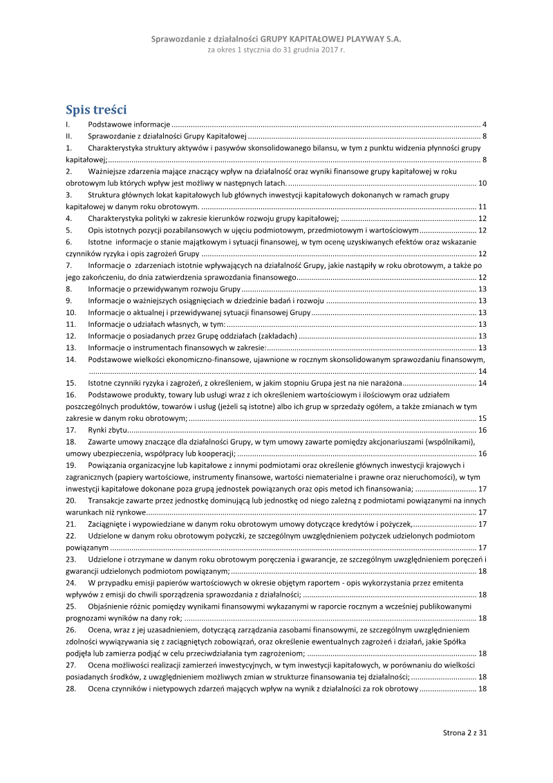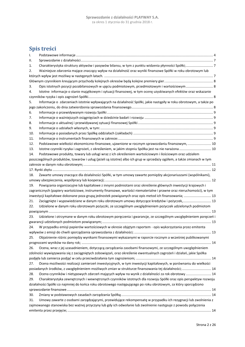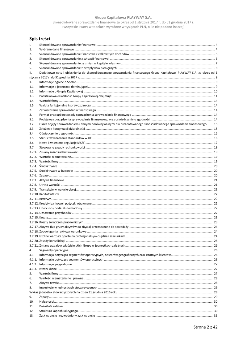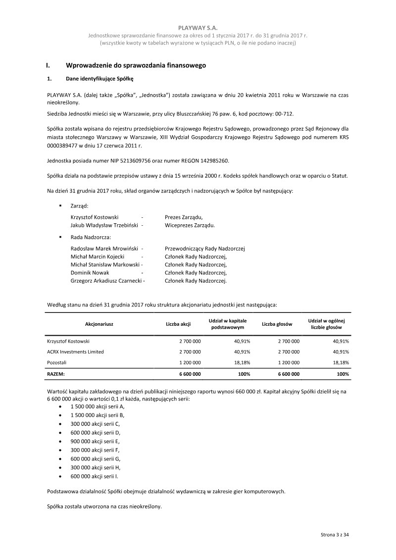 PlayWay S.A. Group achieved exceptional financial growth and market expansion during the 2018 fiscal year, characterized by an 80% year-over-year increase in consolidated revenues to 71.95 million PLN and a nearly 200% surge in net profit. This performance was underpinned by a robust digital distribution strategy, with the Steam platform accounting for 80% of total revenue. Success was largely driven by high-performing titles such as House Flipper, Thief Simulator, and the Car Mechanic Simulator series, which solidified the group's position within the global gaming market. The group maintains a highly liquid financial position, with cash reserves of 69.6 million PLN representing nearly half of total assets and equity covering 93% of liabilities. This capital strength supports a decentralized operational model involving 14 Polish subsidiary studios and a strategy of reinvesting in new development teams, virtual reality technology, and console porting. Ownership remains concentrated, with CEO Krzysztof Kostowski and ACRX Investments Limited each holding a 40.91% stake in the 660,000 PLN share capital. Corporate governance in 2018 was marked by stability in the Management Board and adherence to statutory requirements, though the group noted specific deviations from the Best Practice for GPW Listed Companies regarding meeting broadcasts and formalized internal audit systems. While the group lacks a formal diversity policy, it maintains a functional Audit Committee and utilizes external auditors to ensure financial transparency. Moving forward, the group intends to leverage its early-stage game testing and digital-first approach to sustain its trajectory in the evolving global software market.