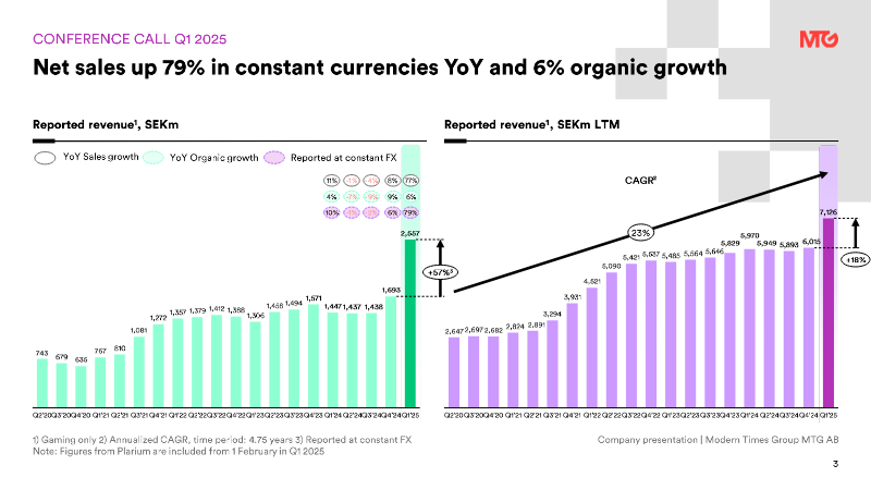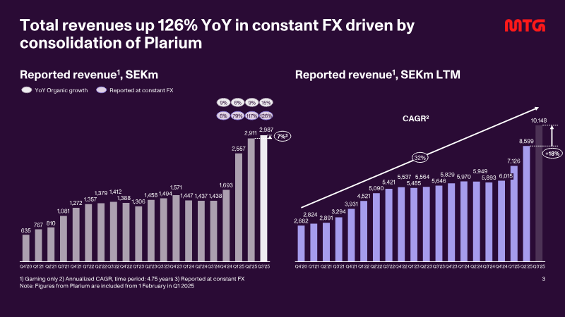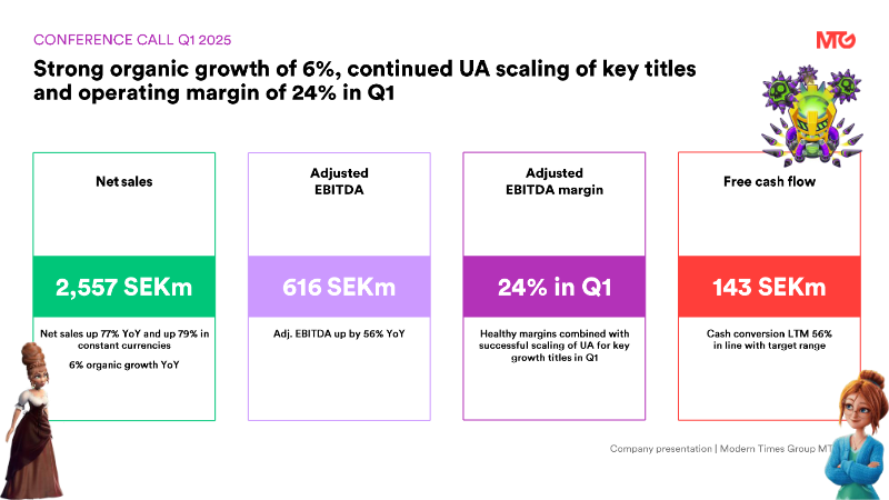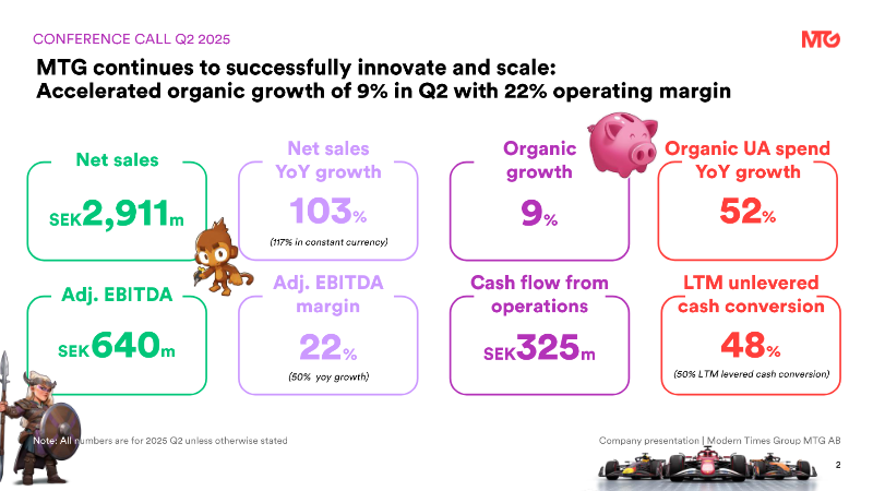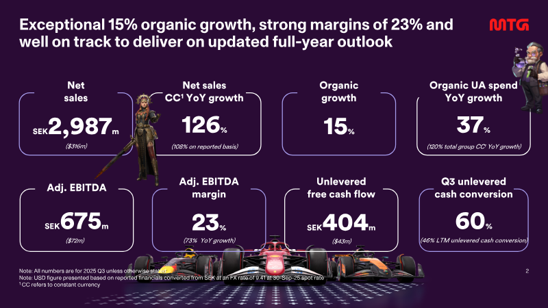 The interim filing presents the fourth‑quarter 2025 financial results for a midcore‑casual gaming group, emphasizing a record‑setting revenue run and the successful execution of a transformation agenda that includes the integration of the Plarium acquisition and the rollout of a new district structure in early 2026. Revenue reached SEK 3,123 million, reflecting 108 % organic growth year‑on‑year and a 25 % increase on a constant‑currency basis, while adjusted EBITDA rose to SEK 717 million, delivering a 23 % margin that matches the full‑year figure. Unlevered free cash flow amounted to SEK 878 million, with a cash‑conversion rate of 66 % and a leverage ratio of five times EBITDA, underscoring robust liquidity and disciplined capital management. User‑acquisition spending accelerated, representing 38 % of quarterly revenue—up from 37 % in the prior quarter—and grew 76 % on a reported basis, driven by heightened investment in original studios, new casual titles, and the racing franchise. The direct‑to‑consumer channel expanded by 600 basis points to 32 % of total revenue, reflecting a strategic shift toward higher‑margin in‑app purchases. Across the fiscal year, the company posted a 9 % organic revenue increase, with word‑games, racing, and RAID franchises delivering the strongest quarter‑end performance. Operating cash flow for the quarter stood at SEK 840 million, while adjusted net income was SEK 1,390 million, translating to an adjusted EPS of SEK 11.33. The financial outcomes exceed guidance and position the firm to meet its medium‑term outlook, with a pre‑IPO study for PlaySimple concluded and the midcore transformation progressing as planned.