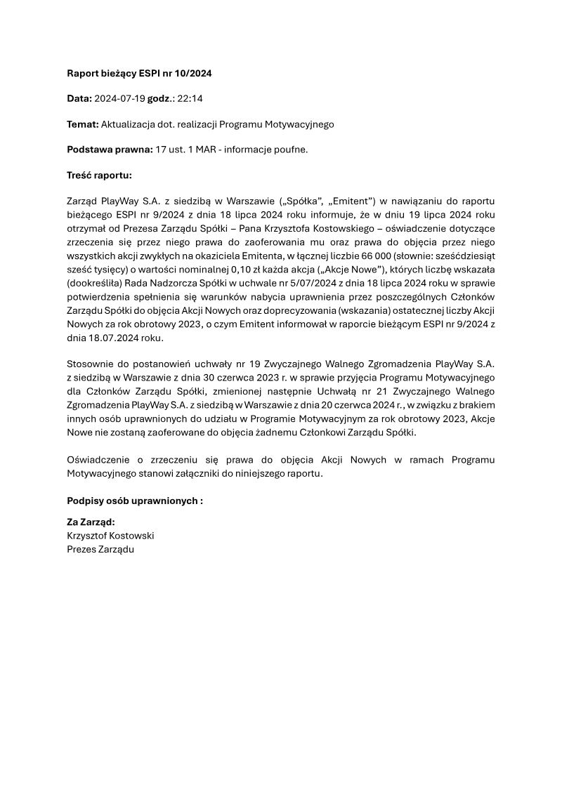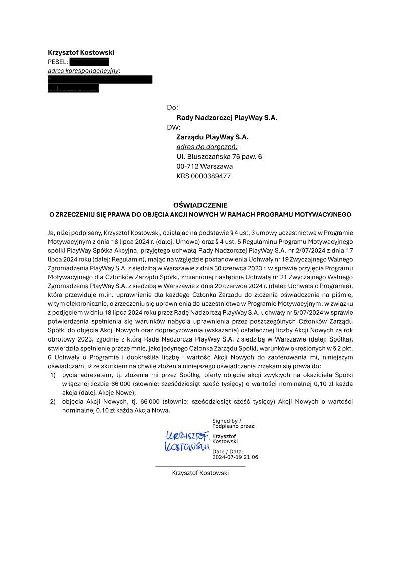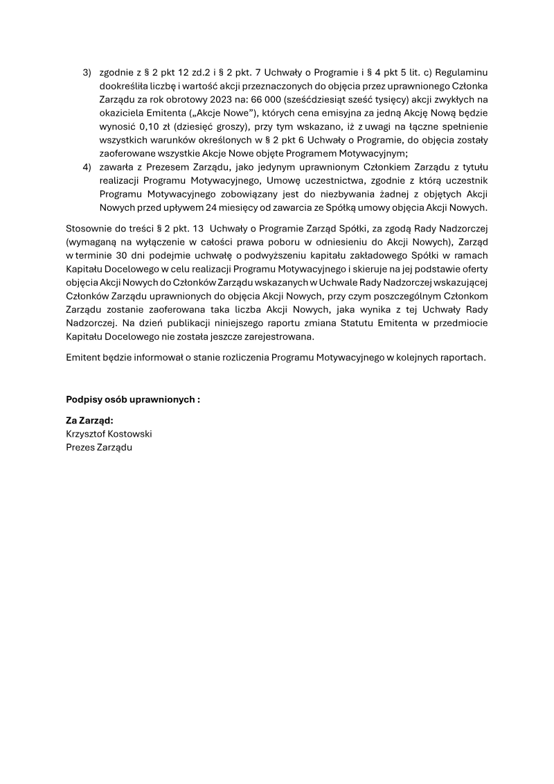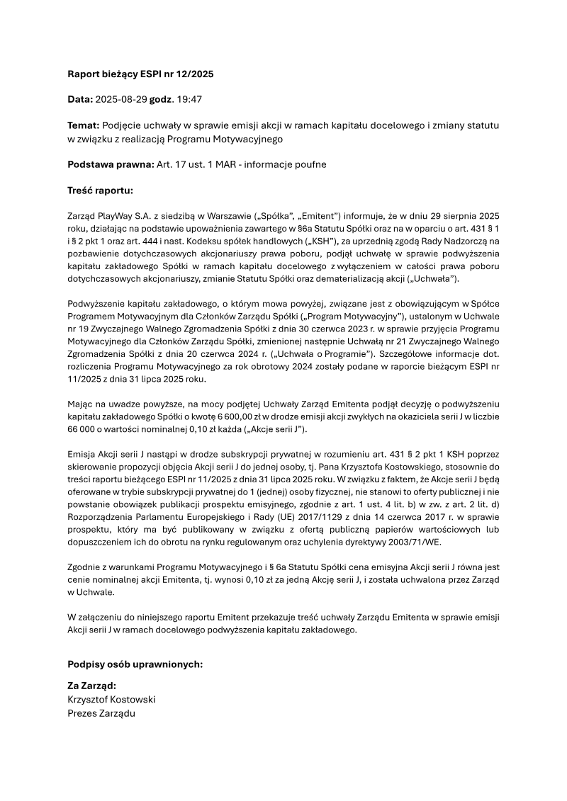 PlayWay S.A. has formalized the issuance of new equity to its leadership as part of a structured incentive program designed to align executive compensation with corporate performance. On September 30, 2025, the company entered into an agreement with Krzysztof Kostowski, the President of the Management Board, for the subscription of 66,000 Series J ordinary bearer shares. These shares were issued at a nominal price of 0.10 PLN per share, following a board resolution passed in August 2025 to increase the share capital within the limits of the authorized capital. This issuance specifically excluded pre-emptive rights for existing shareholders to facilitate the direct allocation of equity to key management personnel. The transaction serves as the final execution phase of the Management Board Incentive Program originally established by the General Meeting in June 2023 and subsequently amended in June 2024. The allocation of these shares is tied to the settlement of the incentive program for the 2024 fiscal year. To ensure long-term commitment and stability, the agreement includes a mandatory lock-up period. The President of the Management Board is prohibited from selling any of the newly acquired Series J shares for a duration of 24 months from the date of the subscription agreement. This corporate action reflects the ongoing governance strategy of the Warsaw-based game developer and publisher, focusing on internal equity-based rewards rather than external market acquisitions. The scope of the disclosure is limited to the internal capital structure of PlayWay S.A. and its executive leadership. By utilizing authorized capital and removing pre-emptive rights, the company has streamlined the process of rewarding its top executive while ensuring that the newly issued shares remain held by leadership for at least two years, thereby signaling confidence in the company’s future valuation to the broader market.
