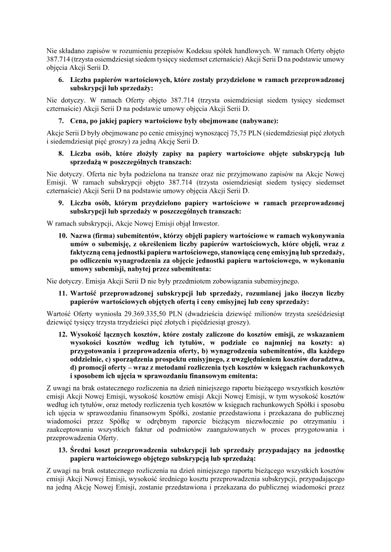 PlayWay S.A. announced the successful completion of its Series J share subscription on September 30, 2025. This issuance was conducted as part of the company’s 2023–2025 Incentive Program for Management Board members, specifically addressing the settlement for the 2024 financial year. The transaction involved the private subscription of 66,000 ordinary bearer shares by Krzysztof Kostowski, the President of the Management Board. The shares were issued at a nominal price of 0.10 PLN per share, resulting in a total subscription value of 6,600 PLN. All shares were acquired through cash contributions. The issuance was executed under the authority of the Management Board to increase share capital within authorized limits, which included the total exclusion of pre-emptive rights for existing shareholders. The total costs associated with the issuance amounted to 9,010 PLN, which exceeded the total value of the shares issued. These costs included 1,015 PLN for offer preparation and 7,995 PLN for registration and listing fees. Consequently, the average cost per share for the subscription was approximately 0.14 PLN. PlayWay S.A. confirmed that these expenses would be accounted for as a reduction in the company’s supplementary capital. No costs were incurred for underwriting, prospectus preparation, or promotional activities, as the offer was directed solely to a single internal participant.