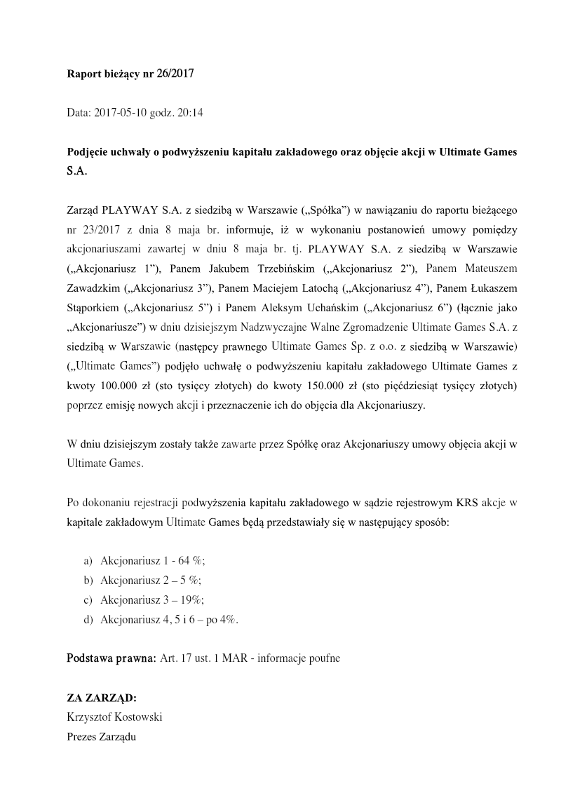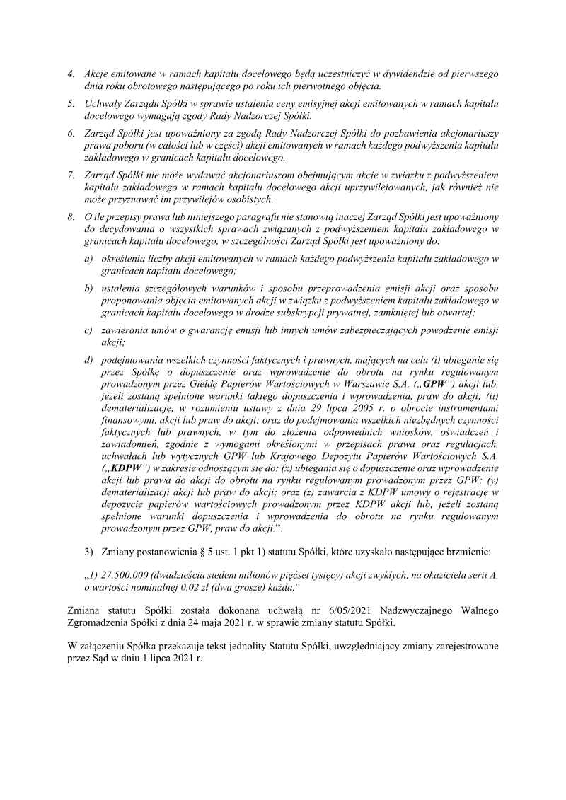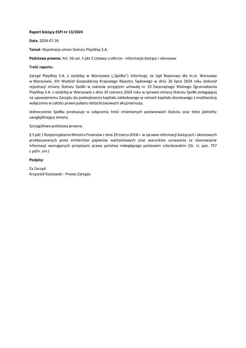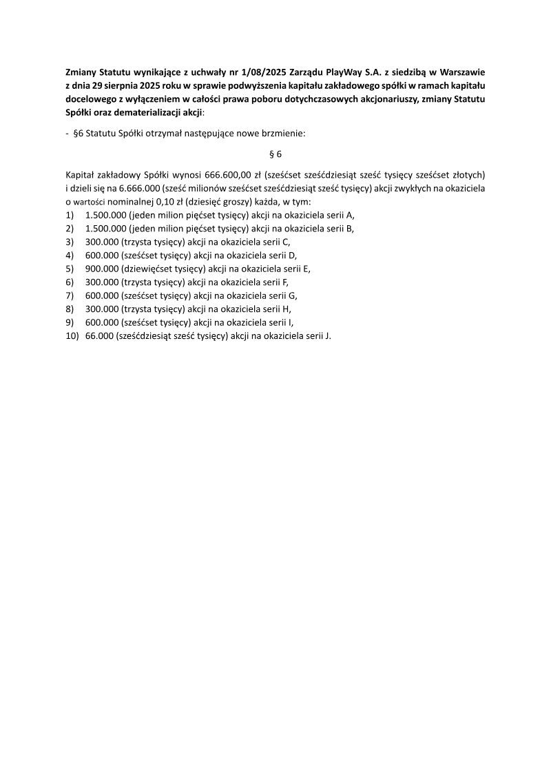 PlayWay S.A., a prominent Polish game developer and publisher, officially registered an increase in its share capital on February 17, 2026. This corporate action, finalized by the District Court for the Capital City of Warsaw, involved raising the share capital from 660,000.00 PLN to 666,600.00 PLN. The increase was achieved through the issuance of 66,000 Series J ordinary bearer shares, each carrying a nominal value of 0.10 PLN. This issuance effectively exhausts the company's remaining authorized capital, leaving the balance of target capital at zero. The capital expansion was executed under the framework of authorized capital previously established by the Management Board in August 2025. A critical component of this issuance was the total exclusion of pre-emptive rights for existing shareholders, a move intended to facilitate the dematerialization of the new shares and streamline the capital raising process. Following this registration, the total number of shares across all series—ranging from Series A through Series J—amounts to 6,666,000, with each share corresponding to one vote at the General Meeting. Beyond the financial adjustments, the registration necessitated formal amendments to the company’s Articles of Association, specifically regarding the wording of Paragraph 6 to reflect the new capital structure. This regulatory filing serves as a formal notification to the market and relevant financial authorities, ensuring transparency regarding the company’s equity structure and voting rights. The action concludes a process initiated in late 2025 and solidifies the company's current financial standing within the Polish capital market.