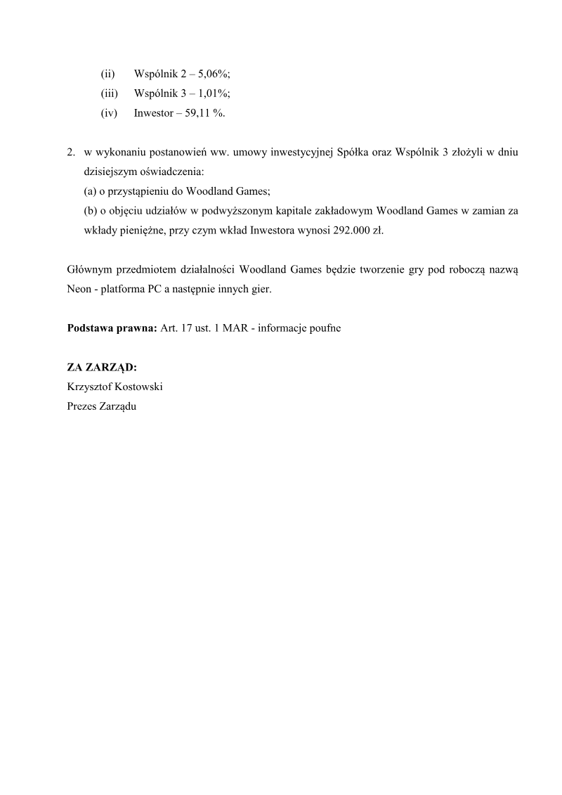 PlayWay S.A. has formally announced a strategic capital increase within its subsidiary, Woodland Games Sp. z o.o., following a resolution passed by the Extraordinary General Meeting of Shareholders on March 5, 2019. The transaction involves raising the share capital of the Włocławek-based developer from 300,000 PLN to 541,100 PLN. This expansion is facilitated through the issuance of 2,411 new shares, which were acquired by a combination of a legal entity and individual developers for a total consideration of 241,000 PLN. Upon the formal registration of this capital increase with the National Court Register, PlayWay S.A. will maintain a controlling interest of 53.96% in Woodland Games. This financial restructuring serves to solidify the subsidiary's capital base as it scales its production capabilities. At the time of the announcement, Woodland Games is actively developing the title Split for the PC platform and has three additional projects currently in the pre-production phase. The disclosure, issued under the requirements of the Market Abuse Regulation regarding inside information, reflects PlayWay’s broader corporate strategy of fostering development teams through equity-based partnerships. By integrating developers directly into the shareholding structure, the company aligns the interests of the creative staff with the financial performance of the studio. This move highlights a specific growth period for the Polish game development sector in early 2019, characterized by the expansion of specialized studios under larger umbrella organizations.