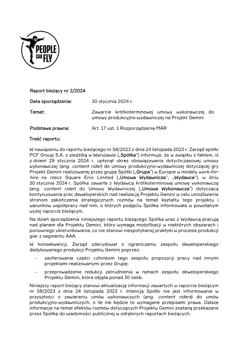 The purpose of the current report is to confirm the finalized plan for Project Gemini and to document the execution of a new content‑rider agreement that amends the existing production‑publishing contract between PCF Group S.A. and Square Enix Limited. The agreement, signed on 19 June 2024, establishes a work‑for‑hire development model for the European team of PCF Group and revises the commercial terms that previously governed the project. Key findings indicate that the revised contract eliminates the prior commercial conditions, resulting in future revenues from Project Gemini covering only the direct costs incurred by PCF Group. Consequently, the updated valuation under International Financial Reporting Standard 15 will lower both the unit and consolidated sales revenue as well as the net profit attributable to the contract. The board estimates a reduction in the margin earned on the entire production‑publishing agreement, reflecting the new cost‑recovery pricing structure. The scope of the update is limited to the European development segment of Project Gemini, with the legal basis anchored in Article 17(1) of the MAR Regulation. The report references earlier updates issued on 24 November 2023 (Report 58/2023) and 30 January 2024 (Report 2/2024), and clarifies that further content‑rider disclosures will be made only when legally required. No additional methodological details are required, as the information derives from internal contractual negotiations and financial reporting standards.