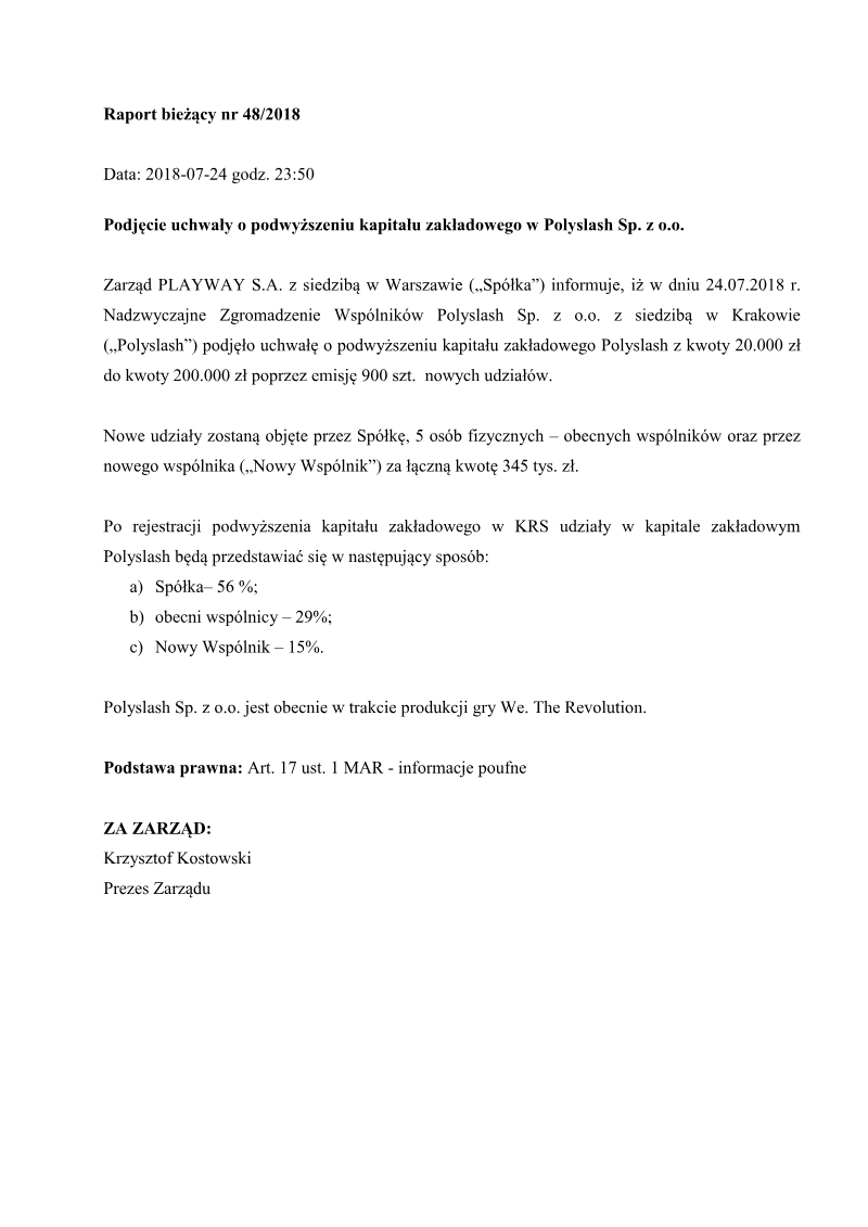 PlayWay S.A., a prominent Polish video game developer and publisher, officially announced the judicial registration of an increase in its share capital and corresponding amendments to its Articles of Association. The District Court for the Capital City of Warsaw recorded these changes on November 7, 2016, following a series of resolutions passed by the General Meeting of Shareholders earlier that year. This corporate action reflects the company’s transition through a public share offering and its regulatory compliance as a listed entity in the Polish capital market. The share capital was increased from 600,000 PLN to 660,000 PLN. This adjustment was achieved through the issuance of 600,000 Series I bearer shares, each carrying a nominal value of 0.10 PLN. Consequently, the total number of shares comprising the company’s share capital rose from 6,000,000 to 6,600,000. The new Series I shares join existing series A through H, maintaining a uniform nominal value across all equity classes. The formal registration also necessitated a revision of Paragraph 6 of the company’s Articles of Association to reflect the updated capital structure. While the company noted it had not yet received the physical delivery of the court's decision at the time of the announcement, the information was verified through the National Court Register’s central database. This update serves as a critical administrative milestone for PlayWay S.A. following its public offering, ensuring that its legal and statutory framework aligns with its expanded equity base.