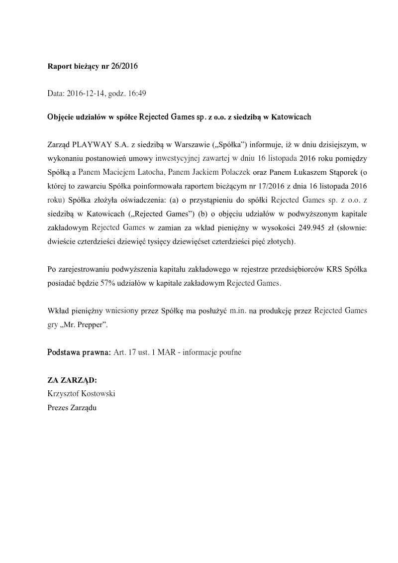 PlayWay S.A. has formalized an investment agreement to acquire a majority stake in the Katowice-based development studio Rejected Games. This strategic move, finalized in November 2016, involves the investor providing a cash contribution of 249,945 PLN in exchange for newly issued shares. Following the capital increase, PlayWay holds a 57% controlling interest in the entity, while the remaining equity is distributed among three individual partners: Jacek Polaczek at 17%, and Maciej Latocha and Łukasz Stąporek at 13% each. The primary objective of this partnership is the development of the computer game titled Mr. Prepper. This investment aligns with the broader industry trend of major publishers securing intellectual property and creative talent through the formation of subsidiary studios. By establishing a controlling stake, the investor secures oversight of the project's lifecycle while providing the necessary financial backing to bring the title to market. This transaction represents a specific expansion of a Polish gaming portfolio during the fourth quarter of 2016. The disclosure follows standard regulatory requirements for public companies regarding confidential information and significant capital investments. The focus remains strictly on the PC gaming segment and the specific production of a single identified title, illustrating a targeted approach to studio incubation and project-based financing within the regional development ecosystem.