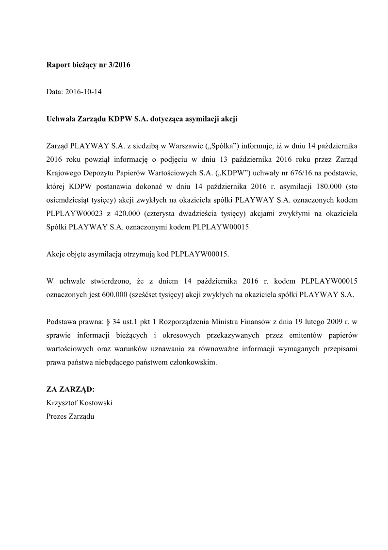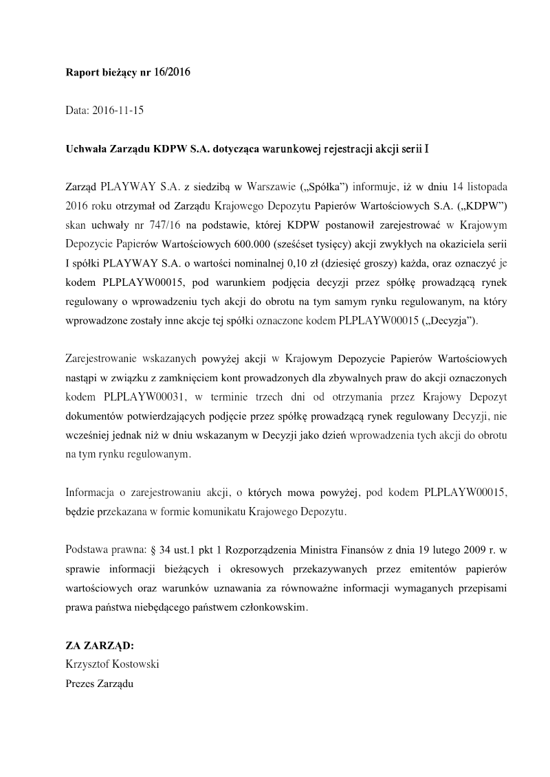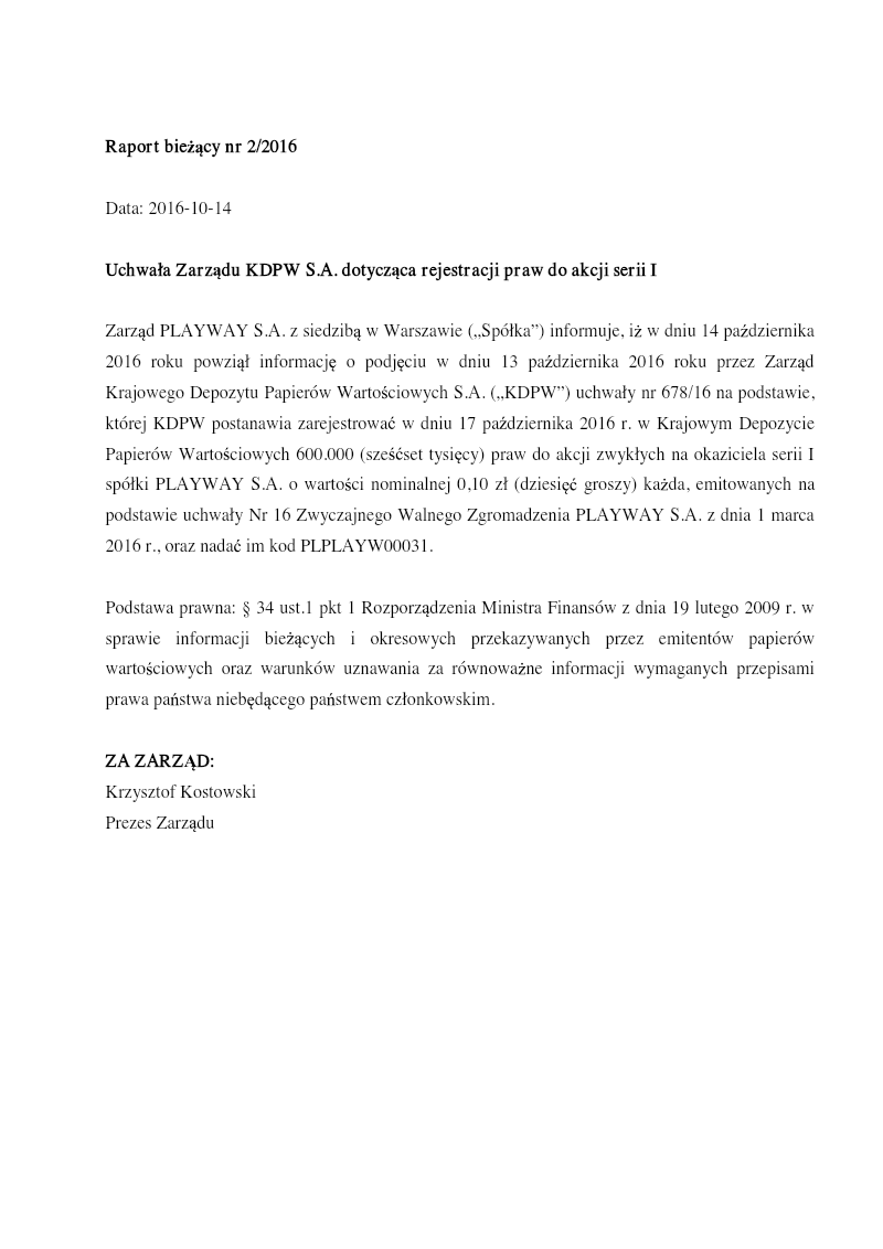 Current Report No. 19/2016 details the formal registration of securities for PlayWay S.A., a prominent Polish game developer and publisher. Issued on November 18, 2016, the announcement confirms that the National Depository for Securities (KDPW) finalized the registration process for 600,000 Series I shares. These securities were assigned the International Securities Identification Number PLPLAYW00015, marking a significant step in the company’s capital structure management and its presence on the public market. The registration was executed in accordance with Resolution No. 747/16 of the KDPW Management Board, dated November 14, 2016. The effective date for the registration of these shares within the depository system was set for November 22, 2016. This action follows previous regulatory filings, specifically referencing a prior report from November 15, 2016, and adheres to the legal requirements established by the Polish Ministry of Finance regarding current and periodic information for issuers of securities. This administrative milestone focuses specifically on the Polish capital market and the domestic gaming industry segment during the fourth quarter of 2016. By securing the registration of these 600,000 shares, the company ensured compliance with the technical and legal frameworks necessary for the circulation of its equity. The notification serves as a formal verification of the company's expanding share base and its adherence to the transparency standards required of entities listed on the Warsaw Stock Exchange.