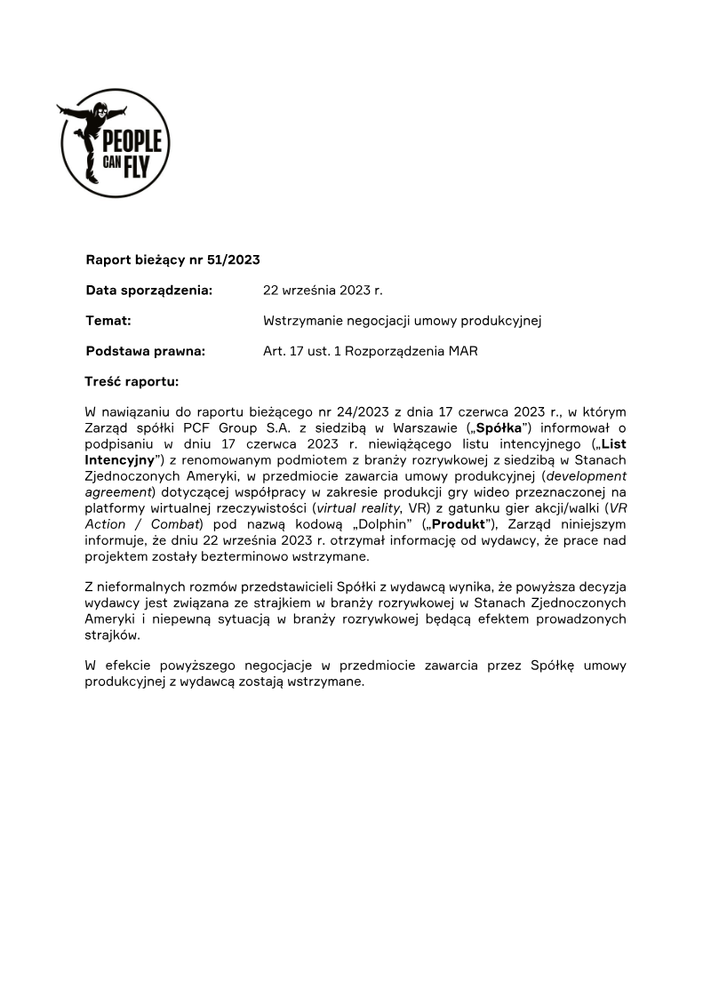The report announces that on 13 June 2023 PCF Group S.A. entered into a Development and Publishing Agreement with Microsoft Corporation to produce and deliver an AAA‑grade title, code‑named Project Maveric k. The agreement designates Microsoft as the publisher and outlines a production schedule in a Product Appendix that details key milestones. PCF Group will develop the game under a work‑for‑hire model, with intellectual property rights retained by Microsoft. Funding is fully provided by the publisher and will be released as each milestone is achieved, with a total budget ranging from $30 million to $50 million. The contract follows standard industry terms for this type of partnership and does not contain any atypical provisions. The agreement aligns with PCF Group’s strategic update issued on 31 January 2023, which stated the company would pursue attractive work‑for‑hire collaborations with reputable partners. The project is geographically focused on the United States, given Microsoft’s headquarters in Redmond, Washington, and targets the global AAA gaming market. No survey or external data sources are cited; the report is a straightforward disclosure of contractual arrangements and financial commitments.