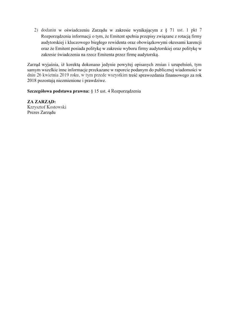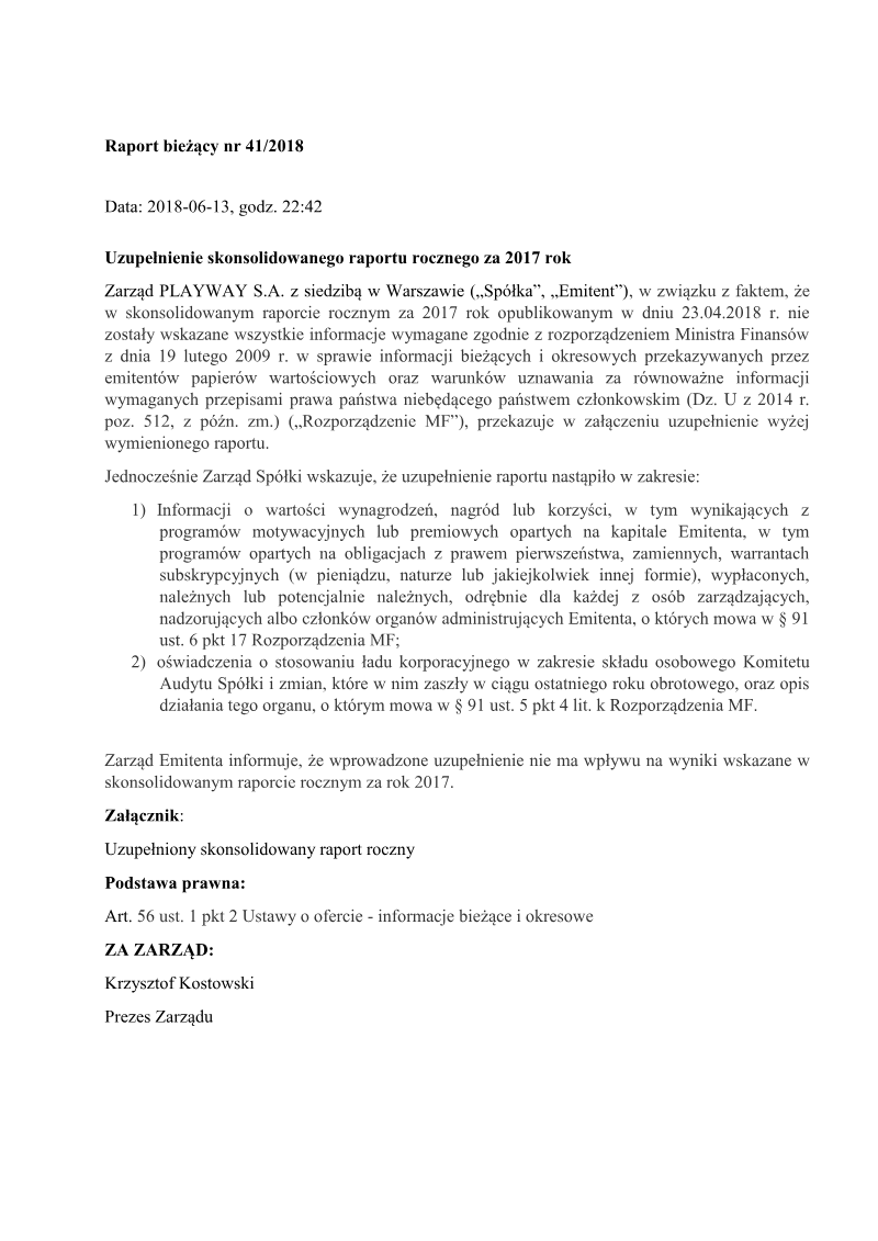 The management board of PlayWay S.A., a prominent Polish game developer and publisher, issued a formal correction to a previous regulatory filing regarding the allocation of its net profit for the 2016 fiscal year. The primary purpose of this update is to rectify a clerical error concerning the legal basis of the original announcement. While the initial report incorrectly cited Article 17 of the Market Abuse Regulation regarding inside information, the corrected filing clarifies that the disclosure falls under standard periodic and current reporting requirements for public companies in Poland. The core financial substance of the announcement remains unchanged, detailing the board's resolution passed on May 15, 2017. The management recommends that the total net profit for the 2016 financial year, amounting to 6,108,553.86 PLN, be allocated entirely to the company’s supplementary capital rather than being distributed as dividends. This proposal reflects a strategic decision to retain earnings within the organization to bolster its financial reserves and support future operational growth. This recommendation is subject to further corporate governance procedures, including an evaluation by the Supervisory Board in accordance with the Commercial Companies Code. The final determination regarding the profit allocation rests with the Ordinary General Meeting of Shareholders. This filing serves as a critical transparency measure for investors on the Warsaw Stock Exchange, providing insight into the company's capital management strategy and fiscal health following its 2016 performance.