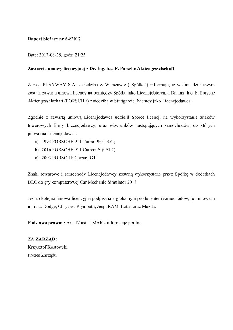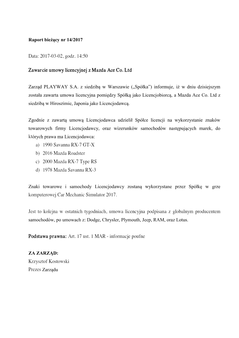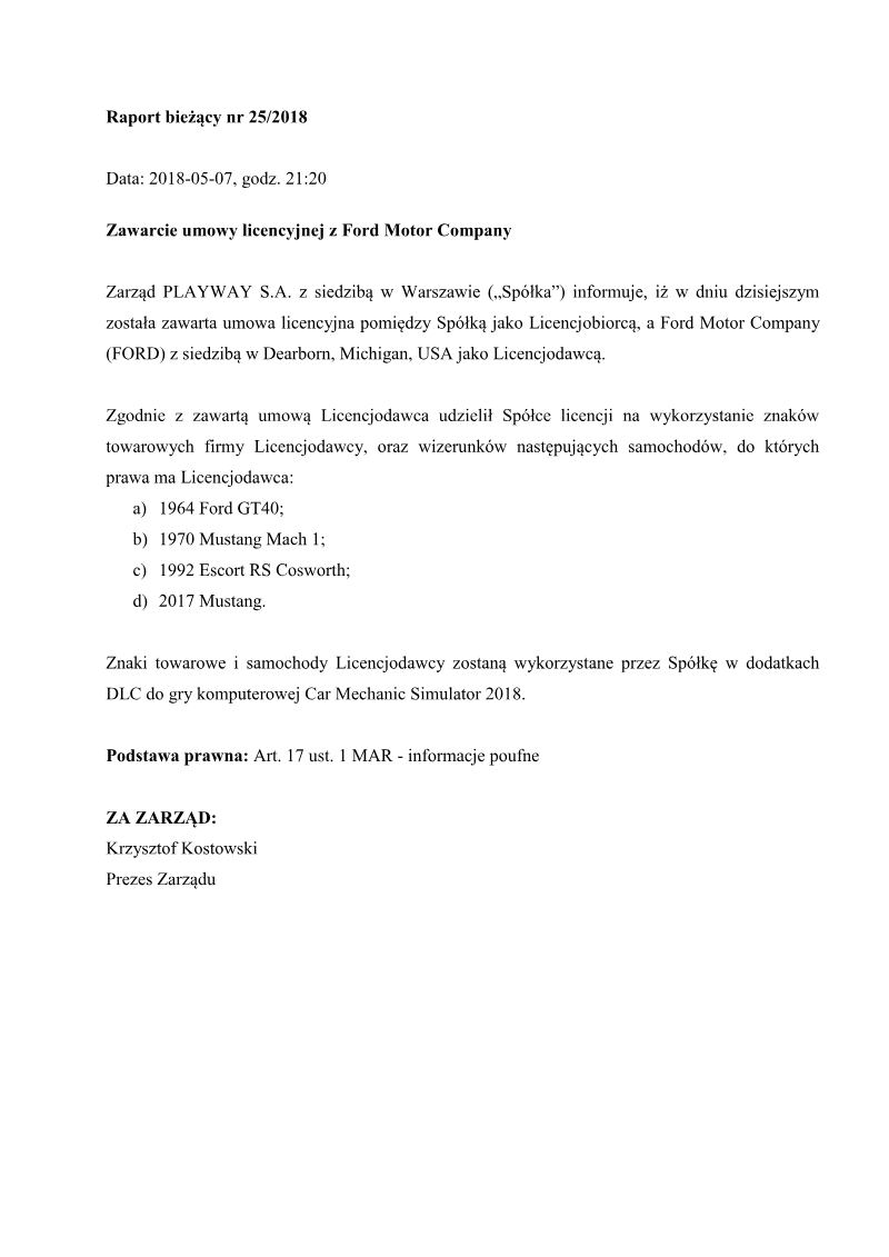 PlayWay S.A. has formally entered into a licensing agreement with FCA US LLC, a subsidiary of Fiat Chrysler Automobiles based in Auburn Hills, Michigan. This strategic partnership grants the Polish game developer and publisher the legal rights to utilize specific corporate trademarks and vehicle designs owned by the American automotive manufacturer. The scope of the agreement covers several prominent automotive brands, specifically Dodge, Chrysler, Plymouth, Jeep, and RAM. The primary objective of this licensing deal is the integration of these authentic automotive assets into the upcoming video game title, Car Mechanic Simulator 2017. By securing these rights, the developer aims to enhance the realism and market appeal of its simulation software through the inclusion of officially licensed vehicles and branding. This move aligns with industry trends where simulation titles seek high-fidelity representations of real-world machinery to satisfy consumer demand for authenticity. This corporate disclosure, issued in December 2016, serves as a formal notification of a significant contractual obligation under market abuse regulations. While the specific financial terms and duration of the license remain confidential, the agreement represents a key milestone in the production cycle of the Car Mechanic Simulator franchise. The geographic impact is global, as the inclusion of these international brands supports the title's distribution across various worldwide digital platforms and gaming markets.