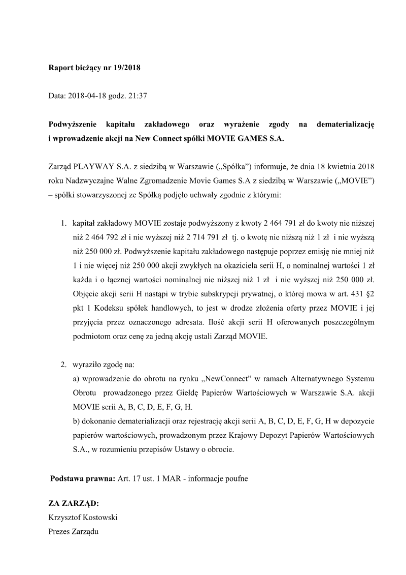 PlayWay S.A. announced a significant corporate restructuring of its associate company, Moonlit S.A., following resolutions passed during an Ordinary General Meeting held on May 23, 2018. The primary objective of these resolutions is to facilitate a capital increase and prepare the Krakow-based game development studio for a public listing on the NewConnect market, which is the alternative trading system operated by the Warsaw Stock Exchange. The approved capital increase involves raising Moonlit’s share capital from 400,000 PLN to a target range between 425,000 PLN and 500,000 PLN. This expansion is achieved through the issuance of Series D ordinary bearer shares, with a minimum of 250,000 and a maximum of 1,000,000 new shares offered. Each share carries a nominal value of 0.1 PLN. This issuance is structured as an open subscription conducted via a public offering, adhering to the legal frameworks established by the Polish Commercial Companies Code and the Act on Public Offerings. Beyond the immediate capital injection, the resolutions grant formal consent for the dematerialization and registration of all share series—specifically Series A, B, C, and D—with the National Depository for Securities. This administrative step is a prerequisite for the planned admission of the company’s shares to trading on the NewConnect market. These actions represent a strategic move by PlayWay to transition its associate entity into a publicly traded company, thereby increasing liquidity and providing a structured platform for future growth within the Polish gaming sector.