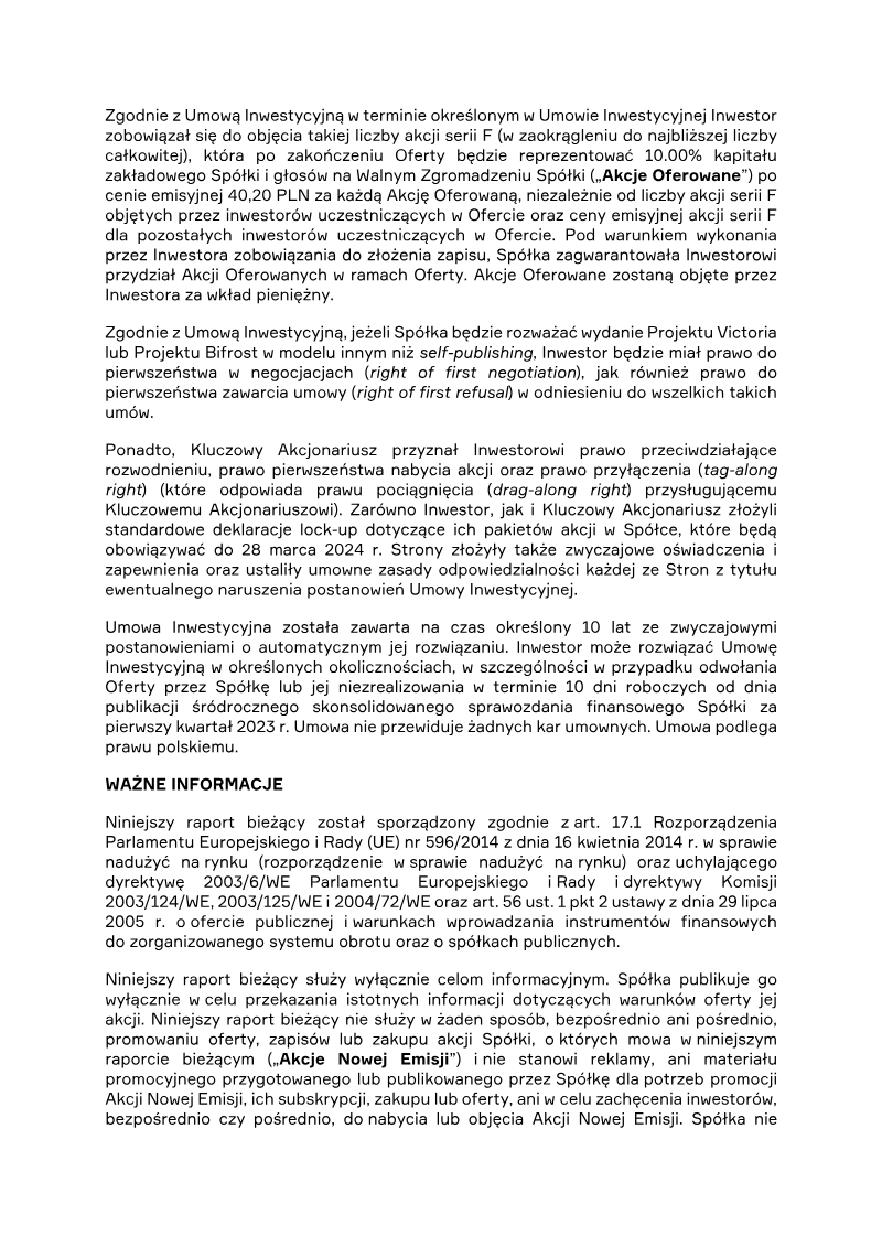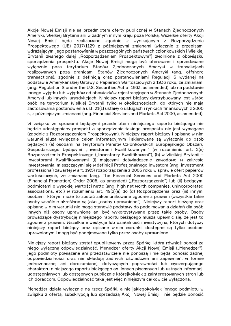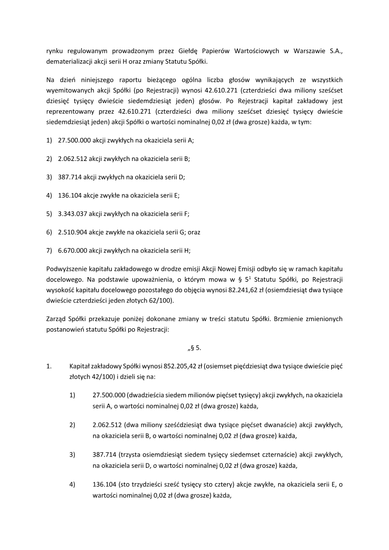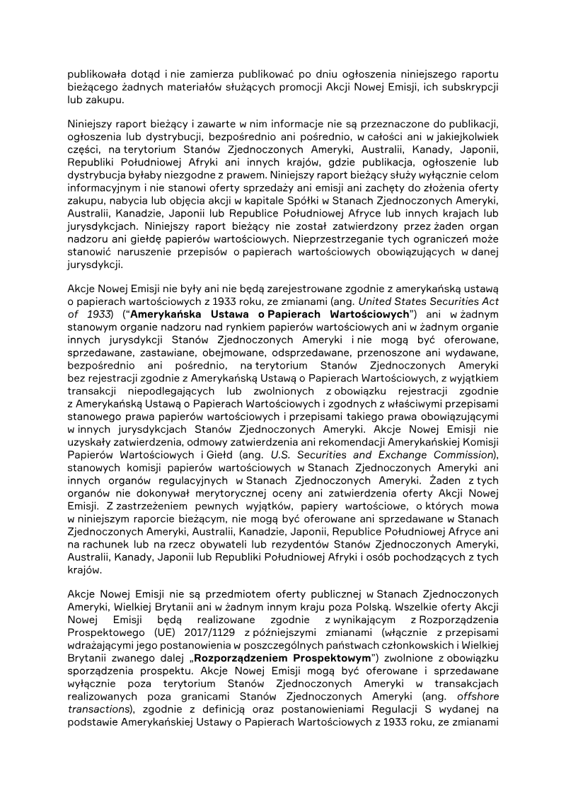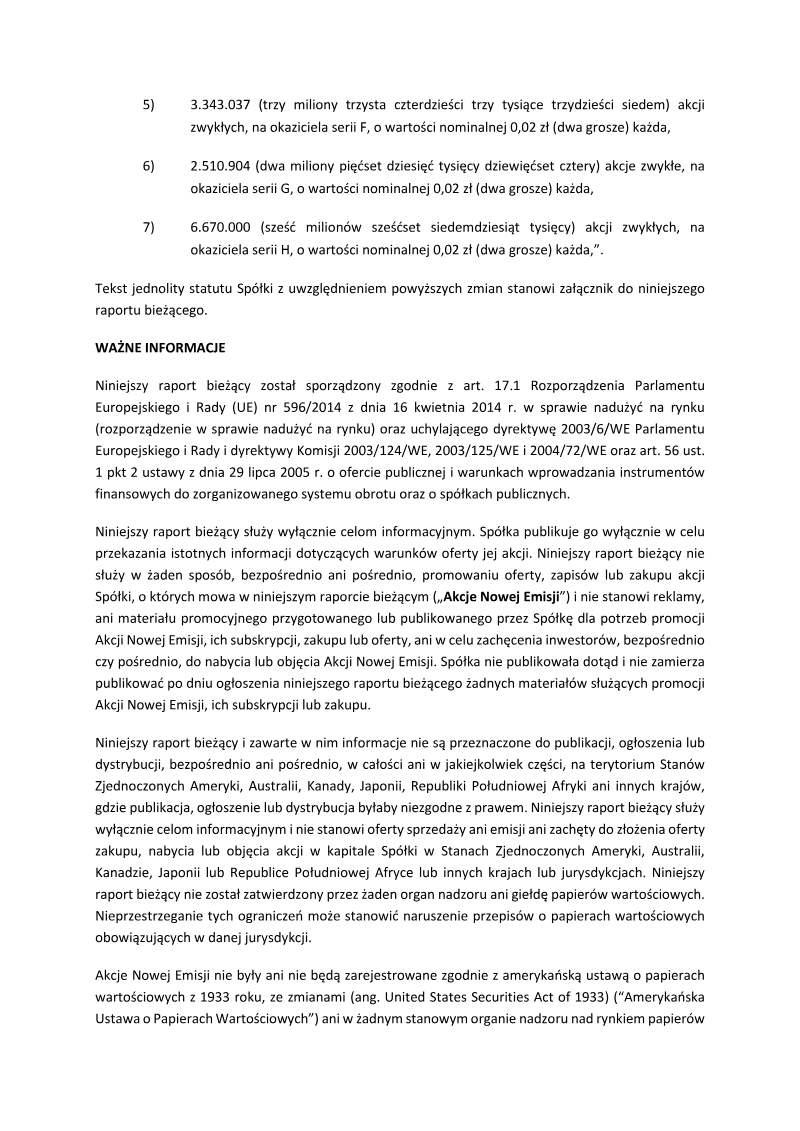 The report announces the successful completion of the private subscription for a new issue of series H common bearer shares of PCF Group S.A., confirming that all 6 670 000 shares with a nominal value of 0,02 zł each were fully subscribed and paid for. The subscription was conducted between 6 and 11 August 2025, with the subscription agreements finalized on 14 August 2025, and the total consideration amounted to 20 010 000 zł, based on an issue price of 3,00 zł per share. Sixteen qualified investors participated in the offering, each entering into a subscription contract for the full allotment of shares. The process was executed as a private subscription under Article 56 of the Polish Public Offering Act and the Commercial Companies Code, and therefore did not require a prospectus. No allocation reductions were applied, and the shares were issued against cash contributions only; no non‑cash consideration, set‑off of receivables, or sub‑issuance arrangements were involved. The scope of the offering is limited to investors residing in the European Economic Area, the United Kingdom, and qualified institutional buyers under U.S. Rule 144A, explicitly excluding distribution in the United States, Canada, Australia, Japan, South Africa and other jurisdictions where the securities would be unlawful without registration. The report complies with EU Regulation 596/2014 on market abuse and the EU Prospectus Regulation, and it emphasizes that the information is for informational purposes only and does not constitute a solicitation or promotional material. Cost details for the issuance have not yet been finalized; the company will disclose the total and per‑share expenses in a subsequent report after receiving and approving the relevant invoices. The overall conclusion is that the subscription was fully executed on schedule, with the capital raised now available for the company’s use, while all regulatory and disclosure obligations have been satisfied.