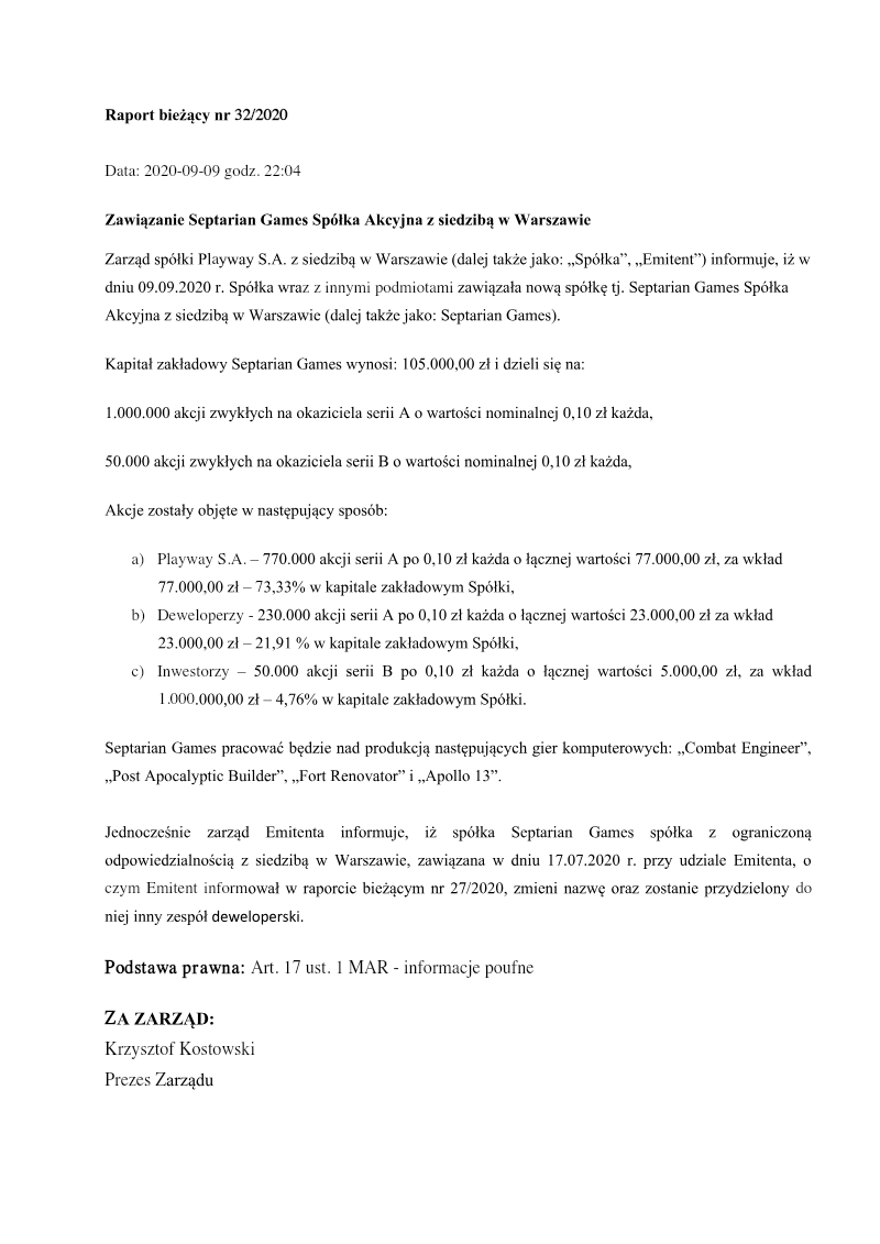 The management board of PlayWay S.A. announced the formal establishment of a new subsidiary, Purple Frog Sp. z o.o., headquartered in Milanówek, Poland, on September 14, 2020. This strategic move expands the parent company’s extensive ecosystem of development studios. The newly formed entity operates with an initial share capital of 10,000 PLN, divided into 200 shares with a nominal value of 50 PLN each. PlayWay S.A. holds a minority stake in the venture, having acquired 49 shares for a total contribution of 2,450 PLN, representing 24.5% of the company’s share capital. The remaining 151 shares, or 75.5% of the equity, are held by the development team and an external investor. This ownership structure reflects a collaborative model where the development team maintains a significant stake while the external investor provides the necessary capital to fund the studio’s first original production. This corporate action follows the standard operational strategy of the Polish gaming sector, where larger publishers foster smaller, specialized studios to diversify their portfolio. The establishment of Purple Frog Sp. z o.o. signifies the commencement of a specific development project backed by dedicated financing, though the specific title or genre of the debut production remains undisclosed at the time of incorporation. The transaction was conducted in accordance with market regulations regarding the disclosure of inside information.