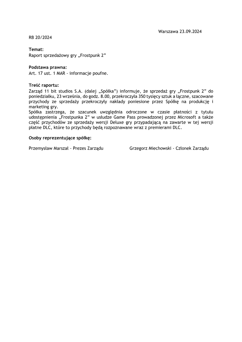 The report, dated 16 August 2021, explains that PCF Group S.A. has not received any royalty payments from Square Enix Limited for the game “Outriders.” According to the production‑and‑publishing agreement signed on 16 February 2016, royalties are payable only after the publisher recovers a specified level of production, distribution and promotion costs from net sales. The agreement also sets a 45‑day payment window following the end of each calendar quarter. That deadline expired on 14 August 2021, and PCF Group’s first working day thereafter yielded no payment. Consequently, the company concludes that the publisher has no obligation to pay royalties for the period covering 1 April 2021 through 30 June 2021. In addition, PCF Group reports that it has not received any sales figures, revenue data or cost information related to “Outriders” from the publisher up to the report’s date. The document serves as a formal notification under Article 17(1) of the MAR regulation, outlining the company’s position on unpaid royalties and lack of transparency from the publisher. No further financial or operational details are provided, and the report focuses solely on the contractual dispute over royalty payments for the specified quarter.