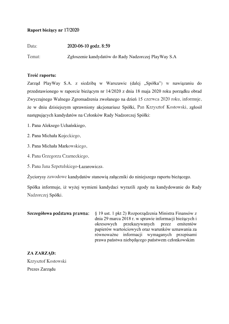 The Board of Directors of PlayWay S.A., a Warsaw-based game developer and publisher, announced significant changes to its Supervisory Board following the Ordinary General Meeting held on June 19, 2017. The primary purpose of the communication is to fulfill regulatory disclosure requirements regarding personnel shifts within the company’s oversight body. The changes include the resignations of Aleksy Uchański and Mateusz Zawadzki, the latter of whom served as Chairman. No specific reasons were provided for their departures. To fill these vacancies, the General Meeting appointed Dominik Nowak and Michał Markowski as new members of the Supervisory Board. Dominik Nowak brings extensive experience from the banking sector, having held leadership roles at mBank, DZ BANK, and ING Bank, supported by an MBA and legal and financial education from the University of Warsaw and the Warsaw School of Economics. Michał Markowski joins with a robust background in capital markets, strategy, and IT, including a doctorate in computer science and experience at the Warsaw Stock Exchange, Deloitte Advisory, and the Ministry of Treasury. Markowski has also served on the boards of various entities, including LOT Polish Airlines and Atende S.A. Following these appointments, Radosław Mrowiński, an existing board member, was designated as the new Chairman of the Supervisory Board. The newly appointed members confirmed they are not engaged in any activities competitive to PlayWay S.A. and are not listed in the Register of Insolvent Debtors. These leadership transitions reflect a strengthening of the board’s financial, legal, and technical expertise as the company continues its operations within the Polish capital market.