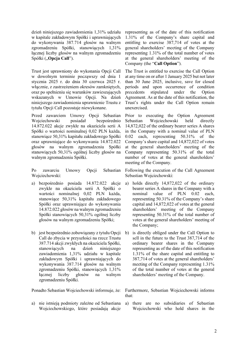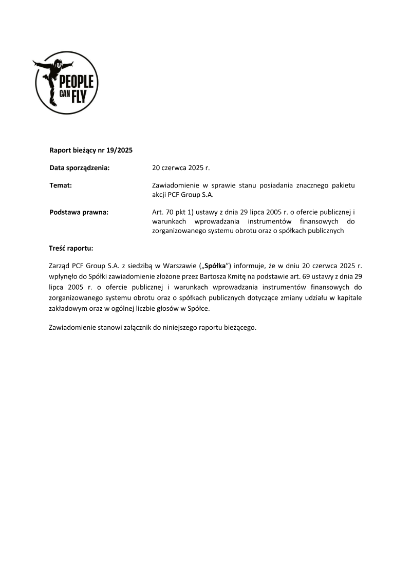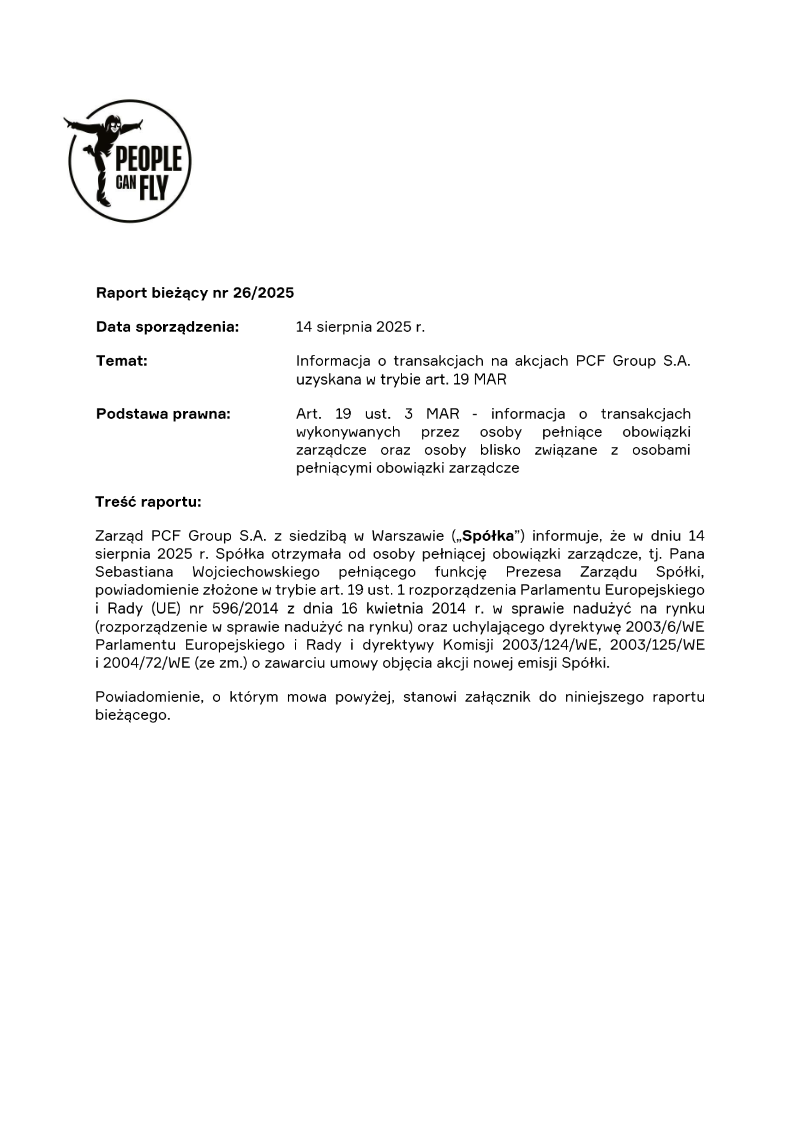 The report serves to disclose, under Article 19 of the EU Market Abuse Regulation, a transaction involving call options granted by the chief executive of PCF Group S.A., Sebastian Wojciechowski, to participants in the company’s 2025‑2027 Motivational Programme. The filing, prepared on 22 October 2025, records a notification received on 21 October 2025 that outlines the structure and conditions of the option grants. The core finding is that Wojciechowski has issued call options that allow programme participants to purchase shares of PCF Group S.A., contingent upon continued employment with the company or its subsidiaries throughout the programme period. The ultimate number of shares available for acquisition will be determined by the fulfilment of the specific criteria set out in the programme documentation. Additional options for the years 2026 and 2027 are to be allocated at the end of each calendar year, extending the incentive framework over the full three‑year horizon. Geographically, the disclosure pertains to PCF Group S.A., headquartered in Warsaw, Poland, and applies to the corporate governance and securities market environment of the European Union. The temporal scope covers the initial notification in October 2025 and the prospective option issuances through 2027. No survey methodology is involved; the information is a statutory filing mandated by MAR, relying on the company’s internal records and the formal notification submitted by the executive.