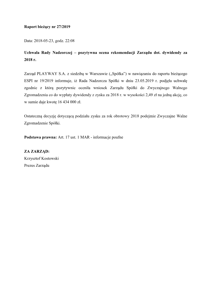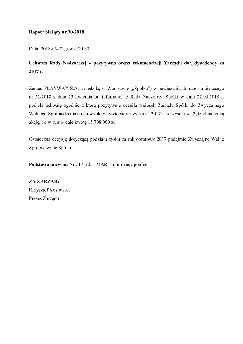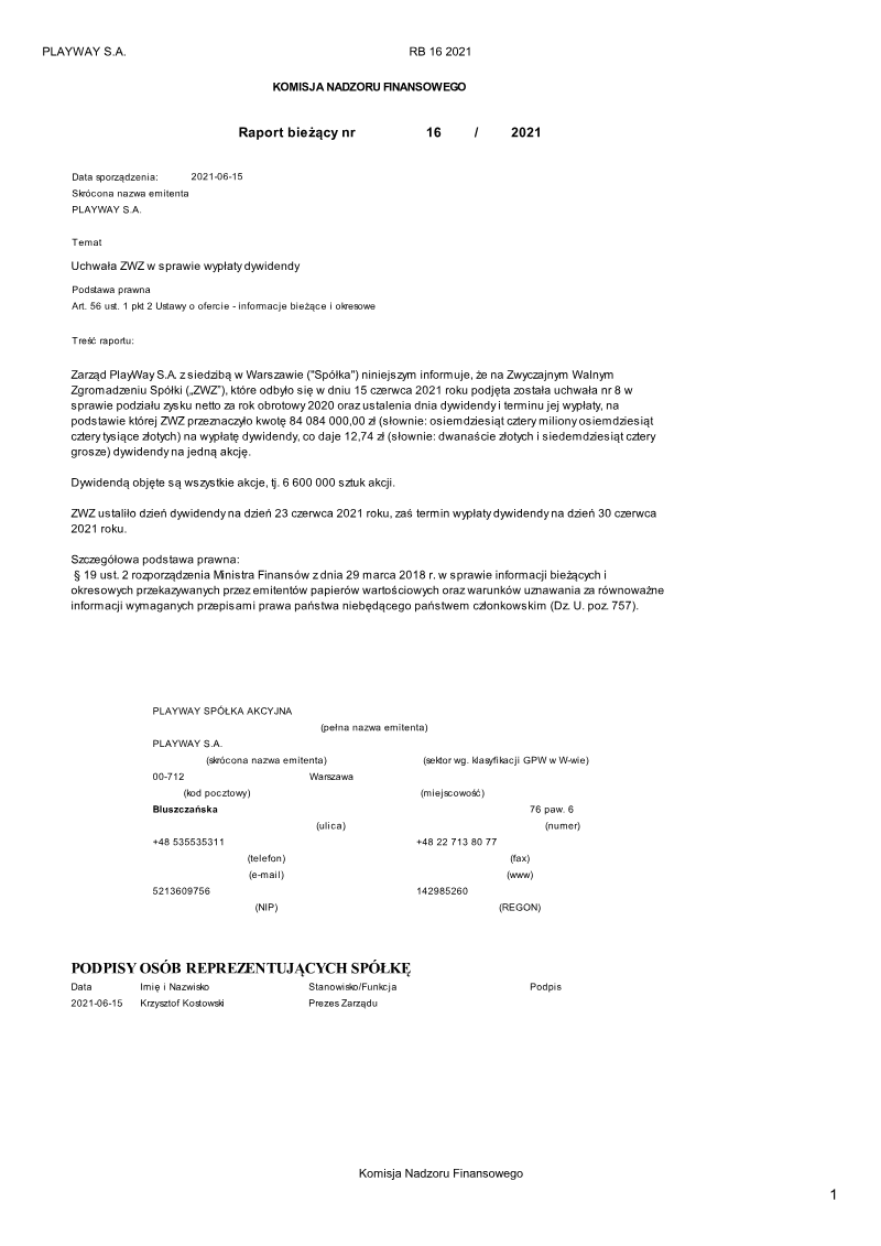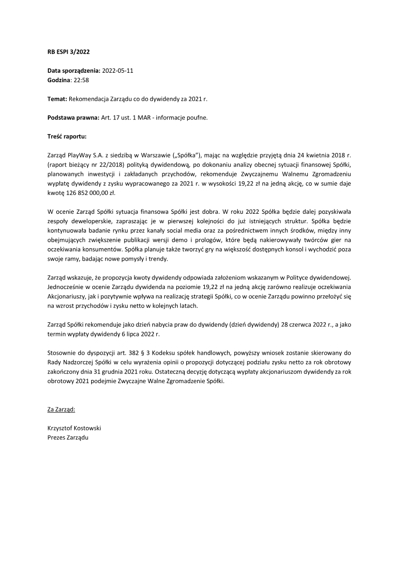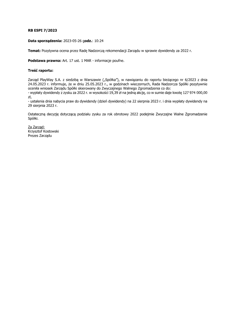 PlayWay S.A. has formally announced that its Supervisory Board issued a positive opinion regarding the Management Board's recommendation for the distribution of profits from the 2021 financial year. This regulatory disclosure, issued in May 2022, outlines a significant capital return strategy for the Warsaw-based game developer and publisher. The proposal involves a total dividend payout of 126,852,000.00 PLN, which translates to a gross payment of 19.22 PLN per share. The timeline for this corporate action specifies June 28, 2022, as the dividend record date, with the subsequent payout scheduled for July 6, 2022. While the Supervisory Board has endorsed these figures and dates, the final execution of the profit distribution remains subject to the approval of the Ordinary General Meeting of Shareholders. This process follows standard Polish regulatory requirements for publicly traded companies on the Warsaw Stock Exchange. This financial decision reflects PlayWay’s performance during the 2021 fiscal period and its commitment to shareholder returns within the competitive gaming sector. By securing the Supervisory Board's backing, the company moves closer to finalizing its annual financial obligations and capital allocation strategy. The announcement serves as a critical update for investors regarding the company's liquidity position and its ability to convert annual earnings into direct shareholder value.